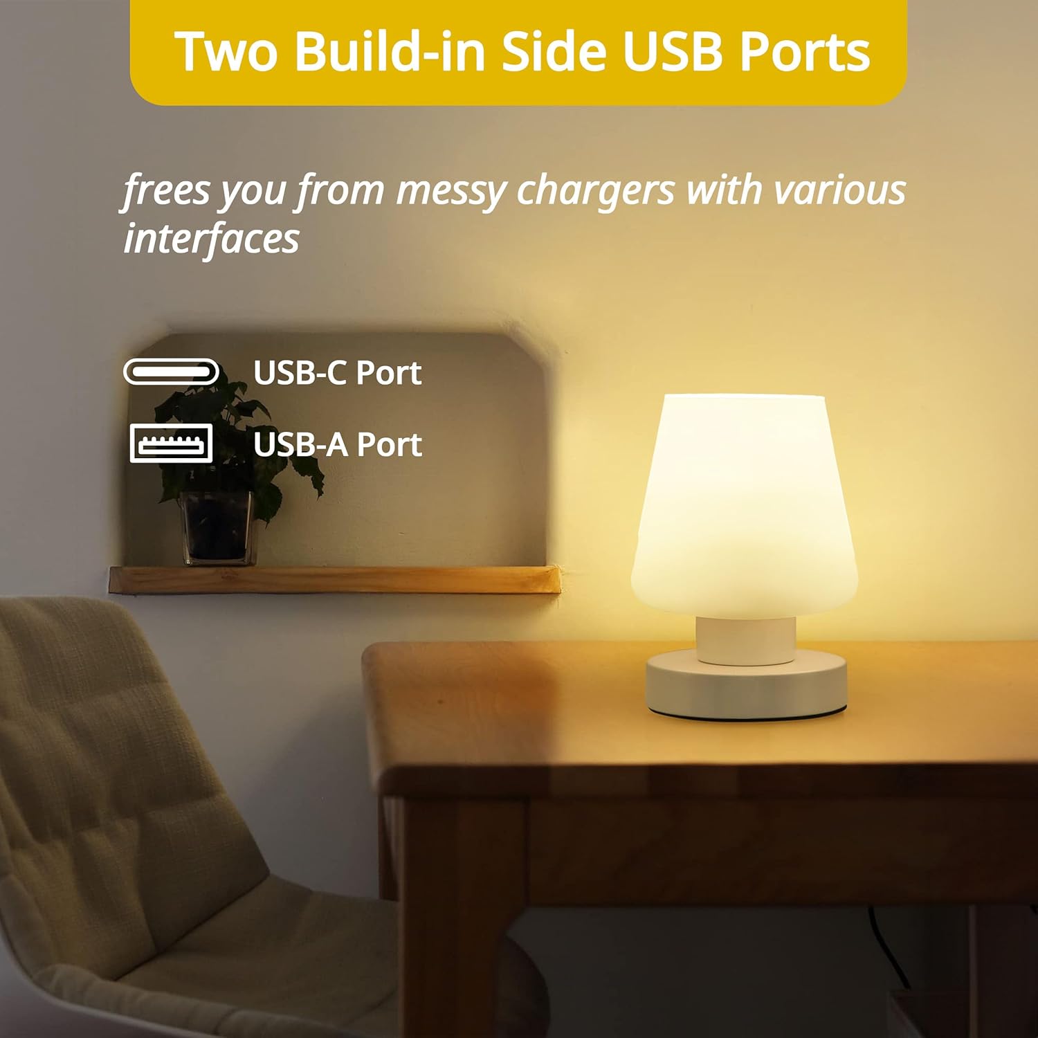 - Package Include: 1 set of stepless dimmable touch bedside lamps with two 5V 2.1A usb charging ports (USB-C and USB-A block, frees you from messy chargers with various interfaces) & glass lamp shapes, 7W 3200K LED Bulbs. 5.2 inches in diameter and 7.2" inches in height.