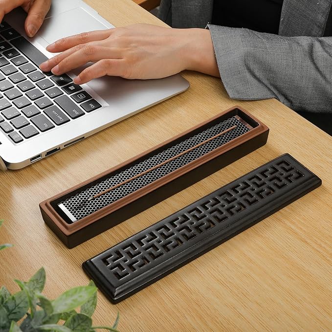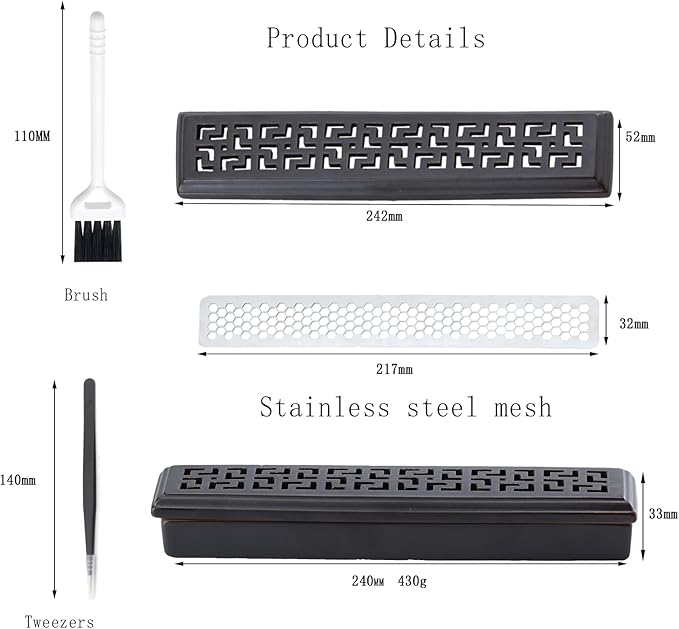 - 【Easy to Use & Easy to Clean】The incense sticks can be placed directly on the stainless steel mesh and the ash will fall through the holes in the mesh to the bottom of the incense burner. Cleaning is also very easy, you just need to remove the mesh and sweep the incense ash away with a brush, or you can clean the incense holder directly with water.