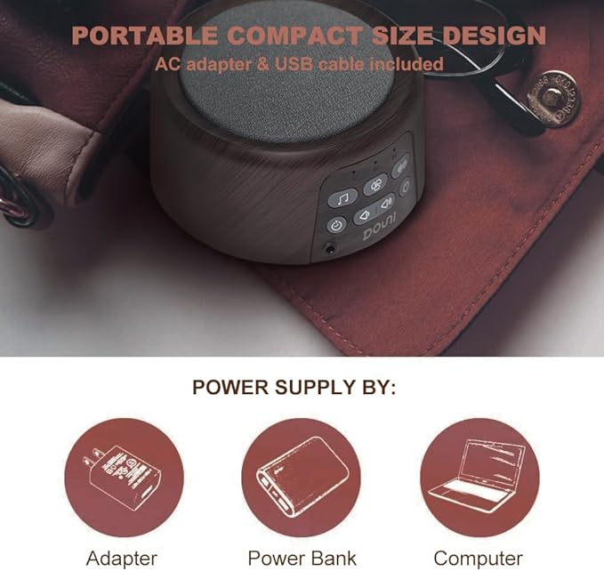 - AESTHETICALLY PLEASING & PORTABLE SIZE: Adorned with a luxurious deep brown wood grain finish, the DOUNI White Noise Machine adds a touch of sophistication to any space. it comes with power adapter and cord so you can take it wherever you go. this white noise machine fits seamlessly on bedside tables or desks, perfect for home, office, or travel use.