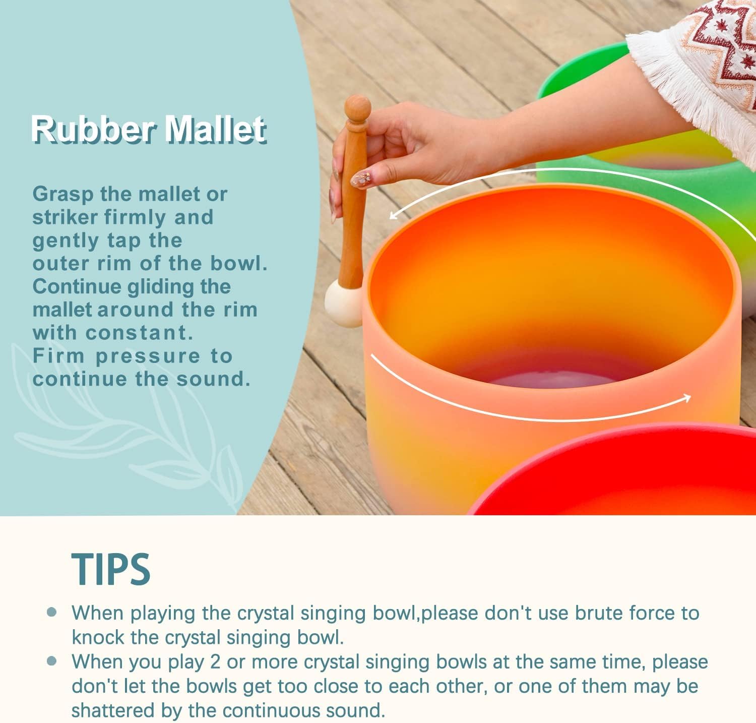 - Items include : Rainbow Crystal Singing Bowl Set--high quality rainbow crystal singing bowl*7 ¨12"C 11"D 10"E 9"F 8"G 7"A 6"B, suede stick*2, rubber mallet*2, o-ring*7, 2 pcs Carrying Bags