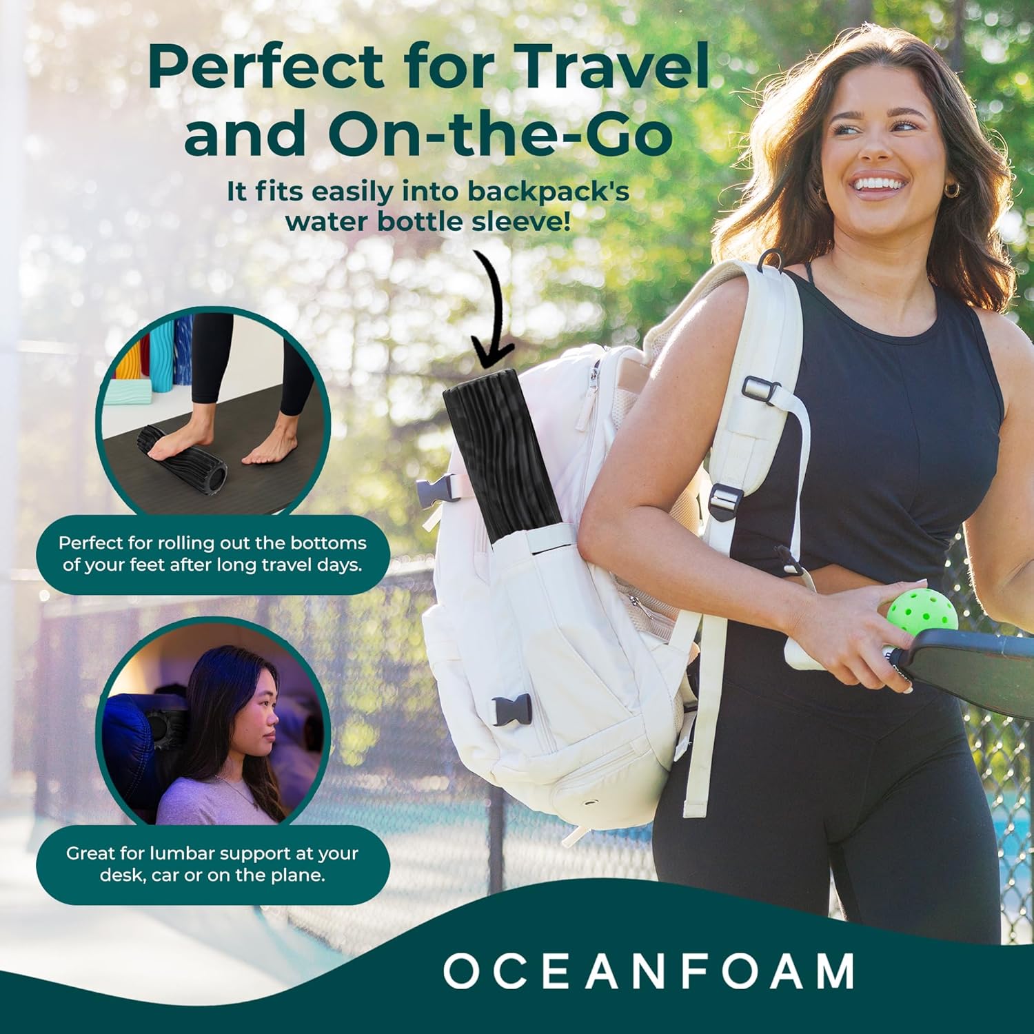 Oceanfoam Ripple Travel Foam Roller (11" x 3.35") Firm Mini Foam Roller for Physical Therapy, Deep Tissue Massage, Back Pain - High Density, Wave Textured - Yoga, Exercise (Black & Charcoal Marbled)