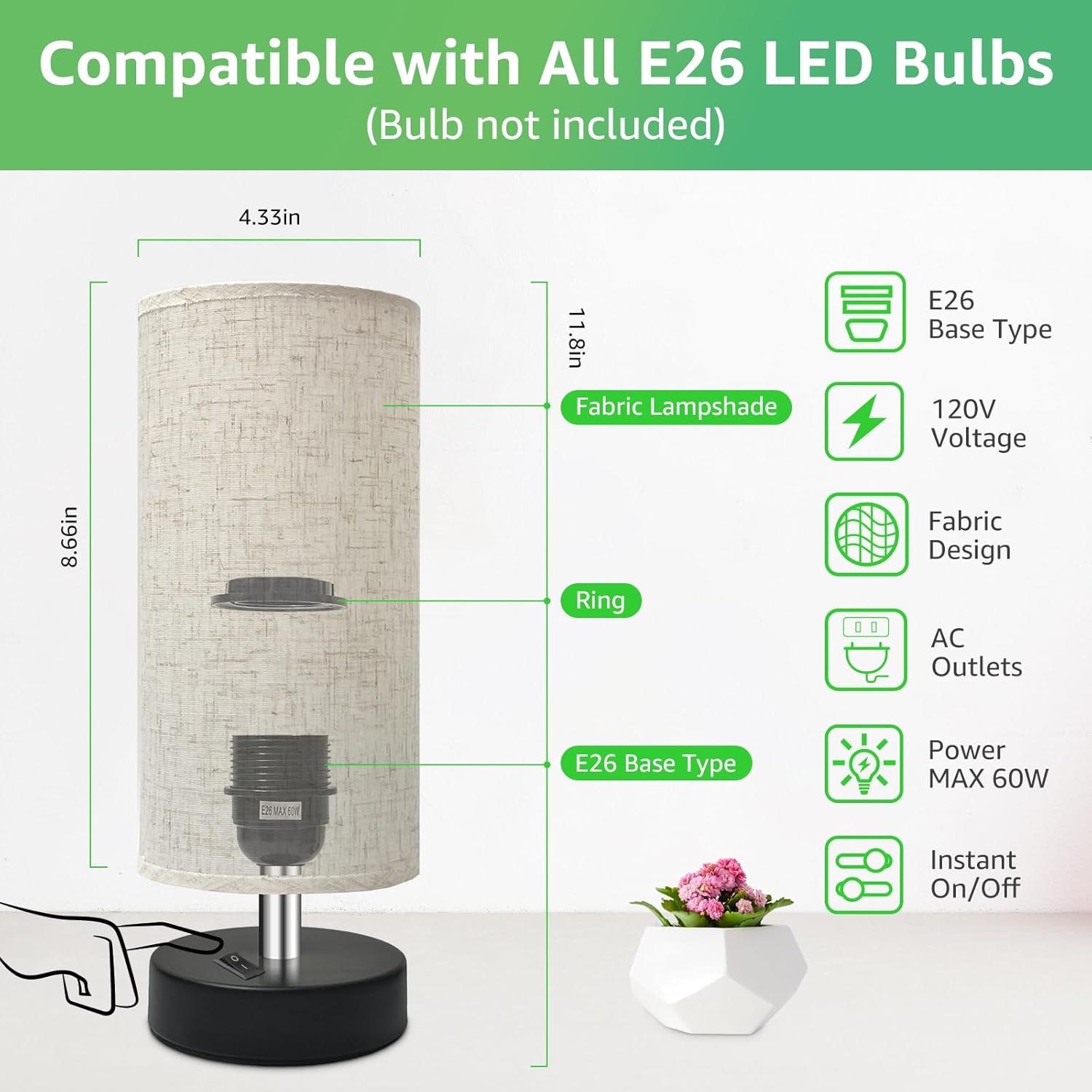 - 【Instant On/Off 】This lamps for night stands comes with an instant on/off switch and AC outlets(2-prong), plug and play, one-button switch, easy to install and use. Please note that bulbs are not included. (Please use the LED bulb, max watt of the LED bulb is 60W)