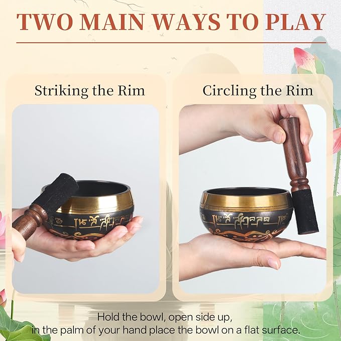 - How to Play: Designed to accommodate practitioners at all skill levels, this singing bowl’s versatility allows you to effortlessly play its fundamental tone with the suede-padded end of the mallet or explore its overtone with the wooden end. Its rich and calming resonance makes it an indispensable tool for meditation and sound healing practices.