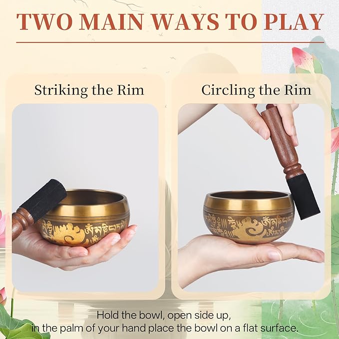 - How to Play: Designed to accommodate practitioners at all skill levels, this singing bowl’s versatility allows you to effortlessly play its fundamental tone with the suede-padded end of the mallet or explore its overtone with the wooden end. Its rich and calming resonance makes it an indispensable tool for meditation and sound healing practices.