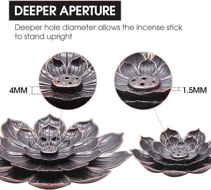 - 【KEEP INCENSE UPRIGHT】Lotus incense holder is designed with a deeper hole diameter. This means that it does exactly what an incense holder is meant to do: holds the incense securely and catches all the ash fall. No more seeing ashes all over the place or watching incense bend over and drop ash beyond the base.