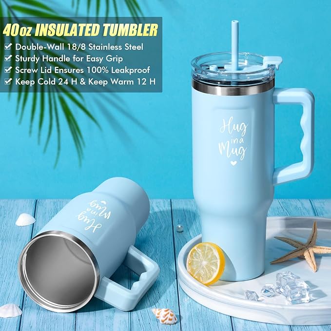 - 40 OZ TUMBLER WITH HANDLE & STRAW: Made of BPA-free premium 18/8 stainless steel, Qinline 40oz tumbler features double-walled vacuum insulation, keeping drinks hot for 12 hours or cold for 24 hours. Its sturdy handle ensures easy carrying, while the spill-resistant screw lid ensures no mess on the go. With a large 40oz capacity and the warm "Hug in a mug" quote, a thoughtful cake package for women self care gift for women to inspire her to stay hydrated and brighten her days with every sip