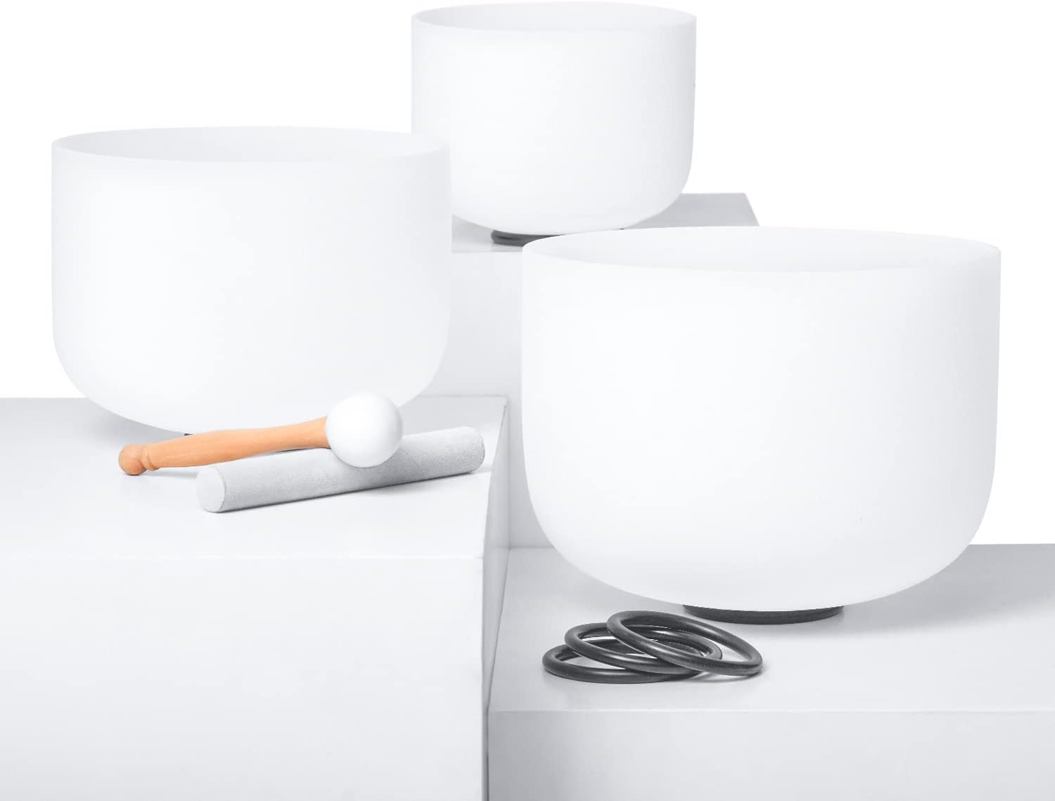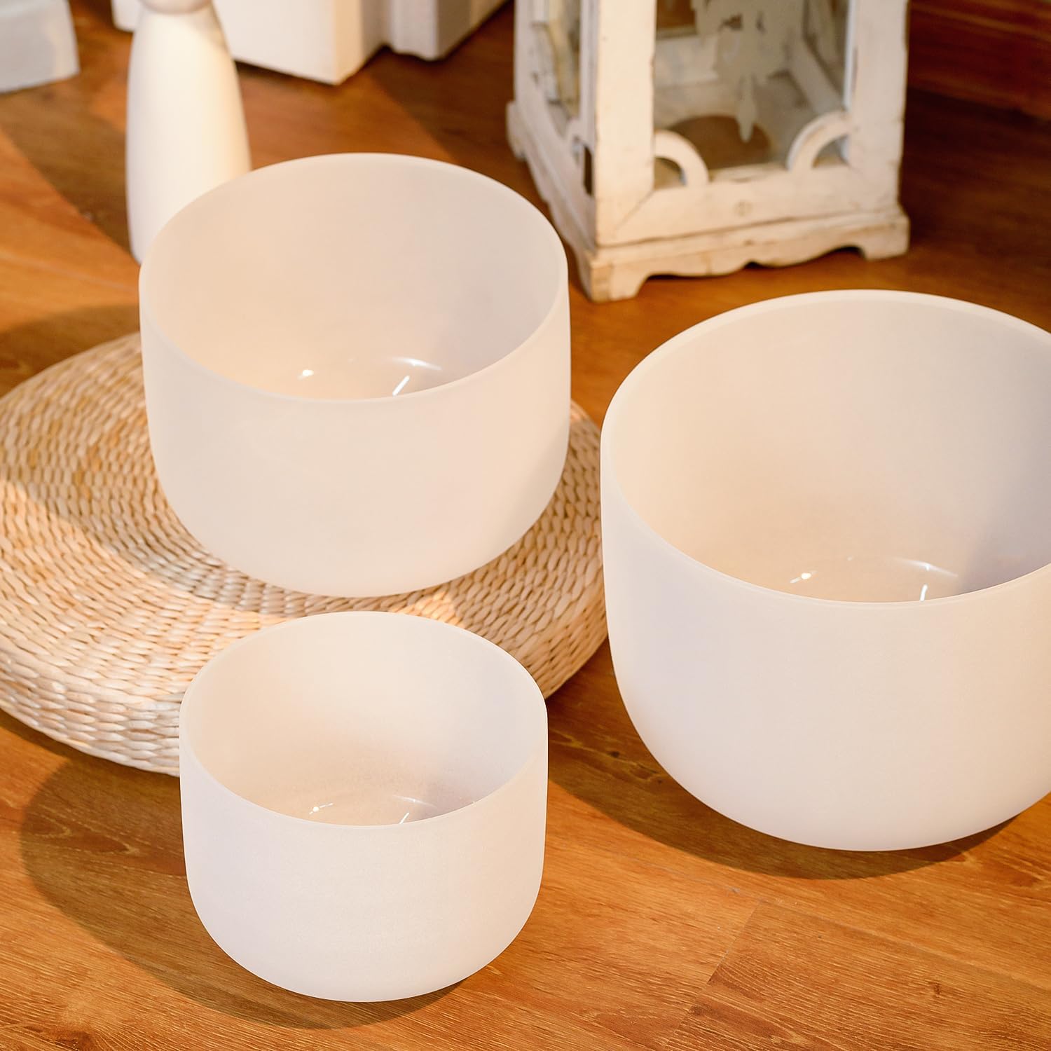 Hye-eun Crystal Singing Bowls Set of 3, 432hz 7"A 9"F 11"D 3pcs Frosted Quartz Chakra Sound Bowl with Carrying Case for Sound Healing Yoga Meditation