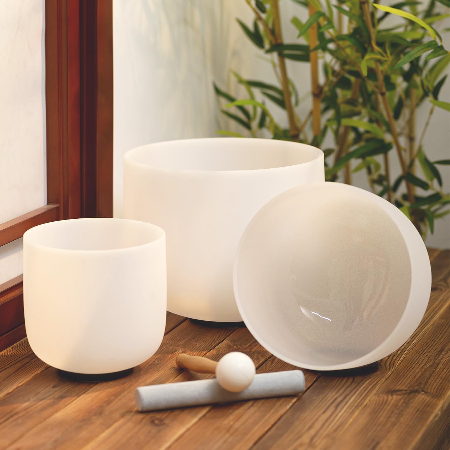 Hye-eu Quartz Crystal Singing Bowls Set of 3pcs 7"G 9"E 11"C 3pcs Frosted Quartz Chakra Bowls 432hz Tuned 7-11 inch with Carrying Case for Sound Healing Yoga Meditation