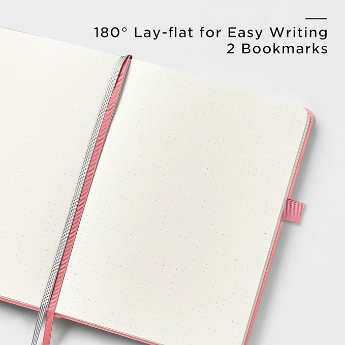 - 180° LAY-FLAT DESIGN: The lay-flat design allows for easy writing and ensures that you can utilize every page efficiently. Journaling, note-taking and planning has never been easier! 2 Bookmarks to help you find important content faster