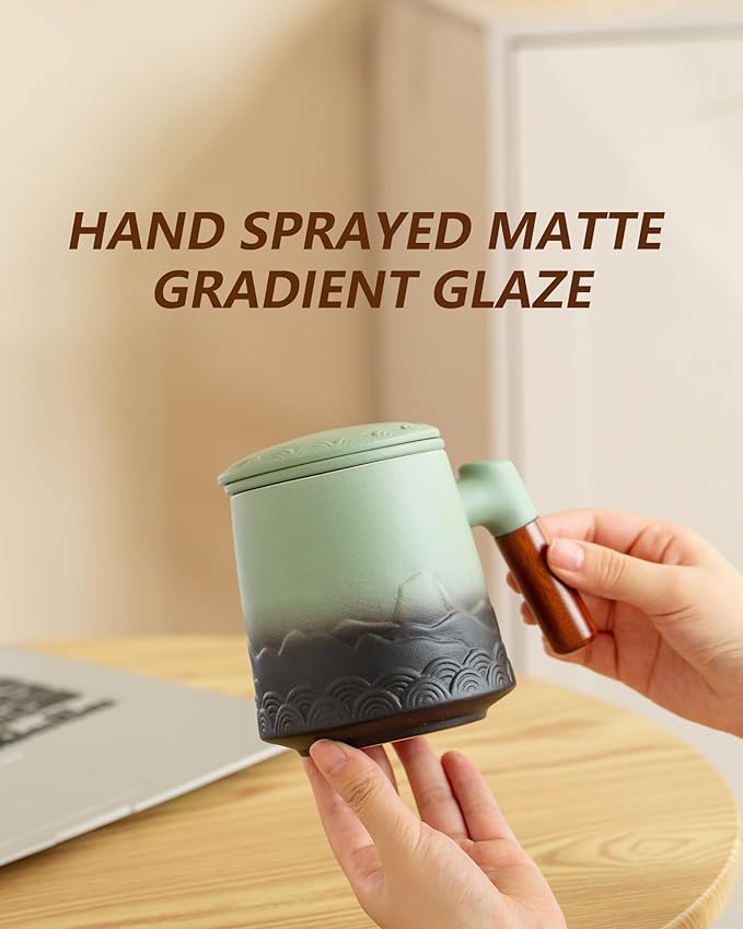 - MATTE HAND SPRAYED TEXTURED GLAZE: Zens tea infuser mug is designed by professional artists, The classic gradient matcha green glazed is hand-sprayed by artisan with embossed mountain view that resembles classic oriental landscape paintings. while the interior glossy glaze that makes it easy to see the color of the warm tea. The artistic wooden handle creates an aesthetic vibe, adds a vintage touch to your coffee and tea table. what a fantastic tea cup for Tea Lovers gifts.