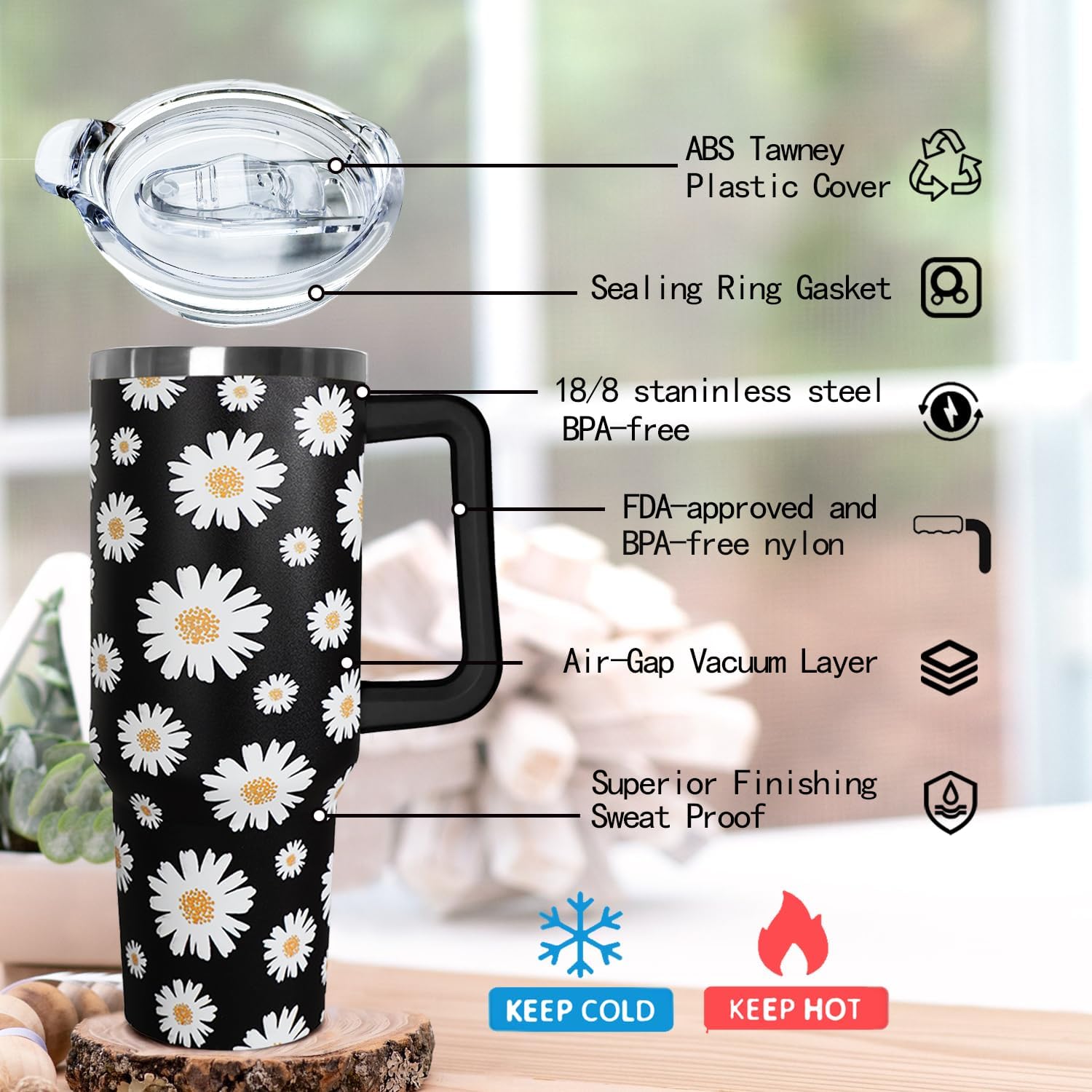 - Suitable Occasion: It 40 oz daisy insulated Stainless Steel with handlewill be an ideal gift for mom, dad or best friend, suitable for daisy decor, daisy accessories, daisy stuff,house warming party, graduation party, birthday party, BBQ or any holiday. Bring you a sense of different experience and mood, very great for the spring, summer or daisy party