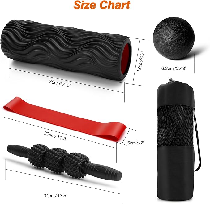 - 【5 in 1 Deep Tissue Muscle Massage Roller Set】 Package includes 1 medium density hollow core foam roller(15"*4.7"), 1 trigger point muscle roller yoga stick(13.5"), 1 massage ball(Φ2.5"), 1 stretching band(24"*2"), 1 storage bag