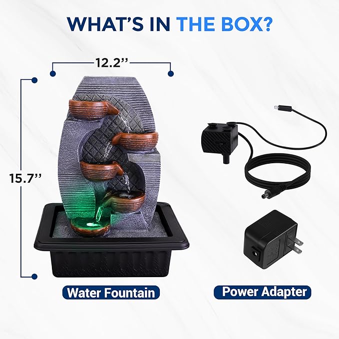 - LIGHTS UP THE MOOD: Enhance your ambiance with the subtle LED lighting effect. This 4-tier relaxing tabletop fountain provides a pleasing visual experience and a serene backdrop to your day, adding a comforting glow to any setting.