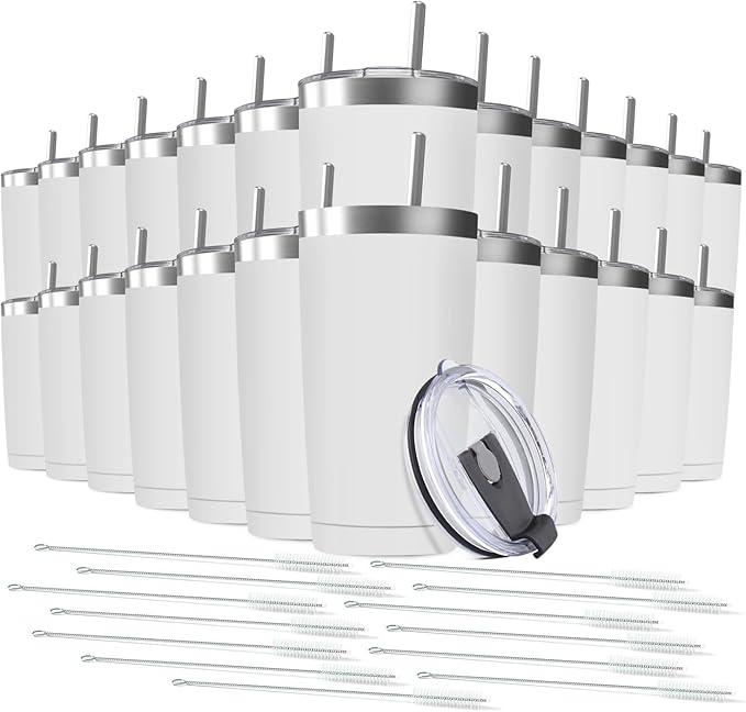 25 pack 20 oz Stainless Steel Insulated Tumbler with Straw and Lid, Double Wall Travel Coffee Mug Vacuum Insulated Bulk Tumbler, Suitable for Vehicle Cup Holders White