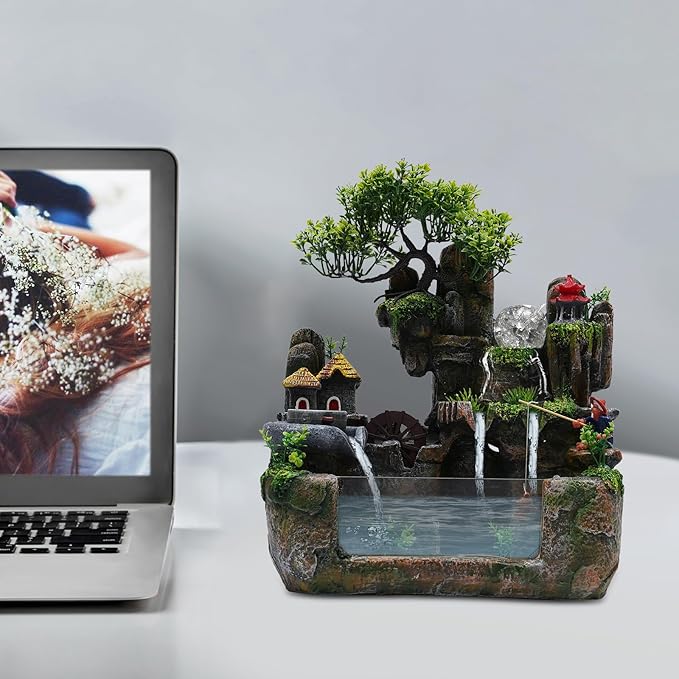 - Multi-functional: This waterfall fountain indoor improves sleep, aids meditation and concentration, and freshens and humidifies the air in dry weather. In addition, flowing water and vintage windmills are symbols of wealth and good fortune