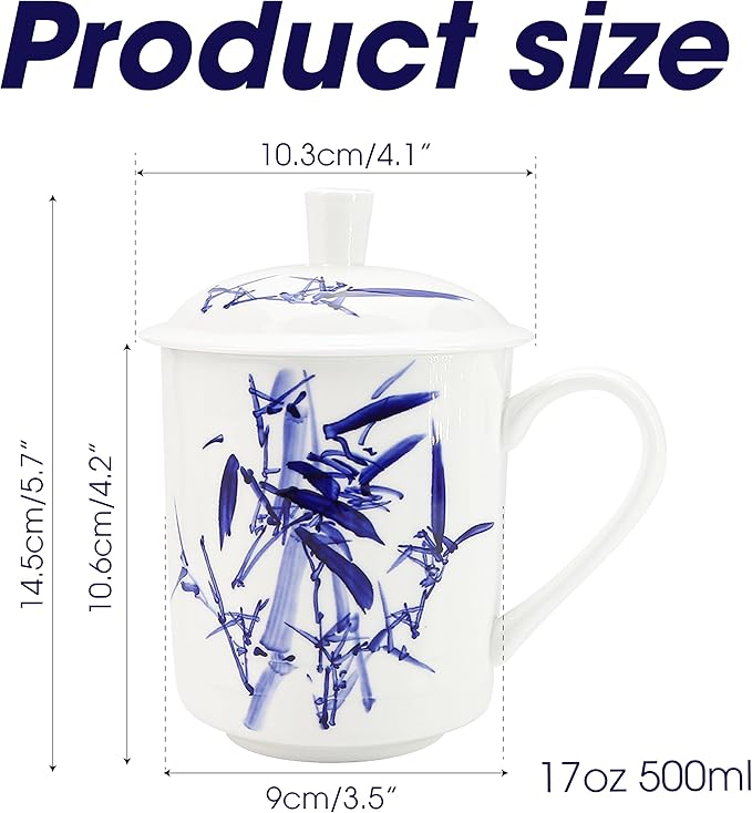 17oz 500ml Chinese Mug Bone China Coffee Teacup with Lid, Small Teapot, High Hand Blown Porcelain Covered Infuser Set for Asian Loose Leaf Gongfu Tea Blue Flower Brewing System for Office Travel Home