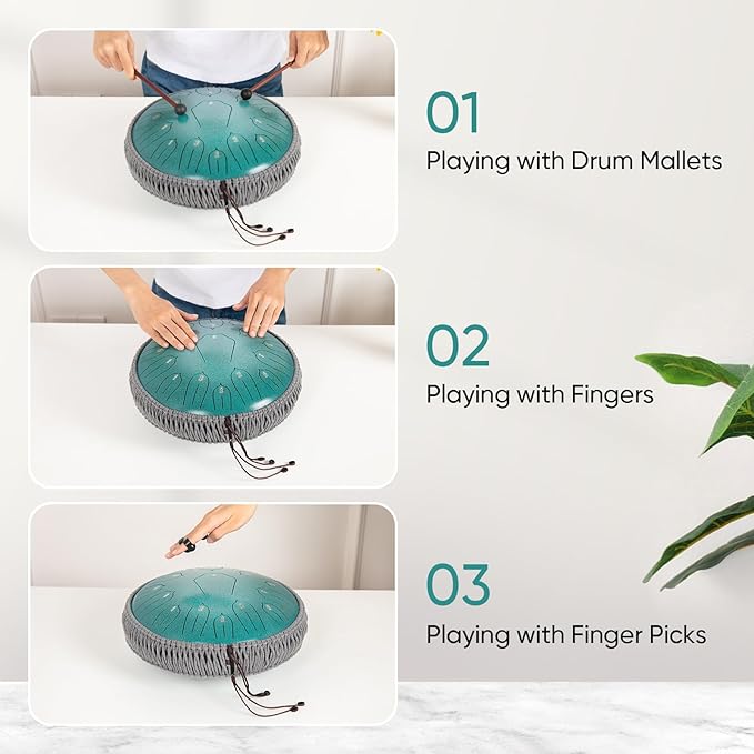 - Easy to Play and Carry: Steel tongue drum comes with music book, mallets and shoulder strap carrying bag, which is portable and convenient to carry, even rains, you can still enjoy the soothing sound of the tongue drum outdoors; Steel drum has different ways to play, you can use the drumsticks and finger picks to play, or play directly with your fingers for different musical expressions