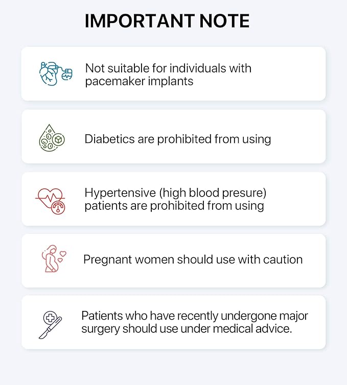 - ⚠️IMPORTANT SAFETY NOTICE: ① Not suitable for individuals with pacemakers. ② Prohibited for diabetics. ③ Prohibited for hypertensive (high blood pressure) patients. ④ Pregnant women should use with caution. ⑤ Patients who have recently undergone major surgery should consult a doctor before use.
