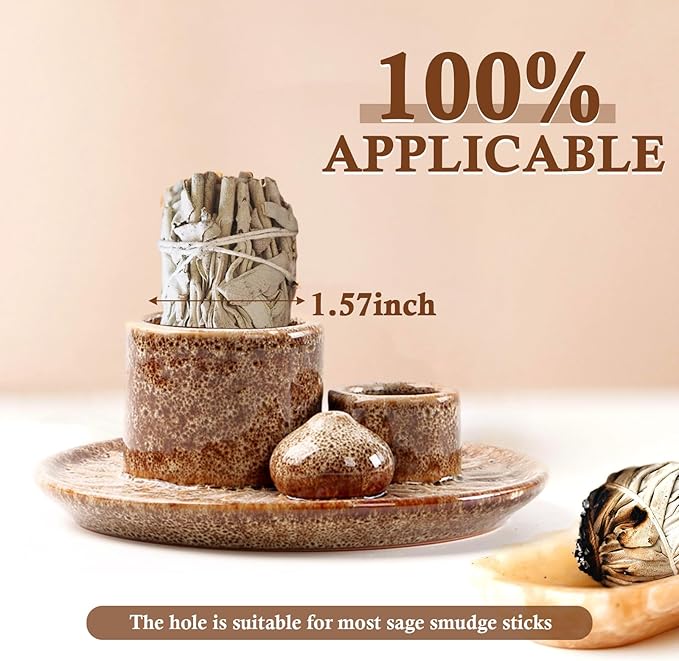 4 in 1 Ceramic Incense Holder, Palo Santo Stick Holder, Sage Holder for Burning, 5.2" Ash Catcher Tray for Meditation, Yoga & Home Decor (Brown)