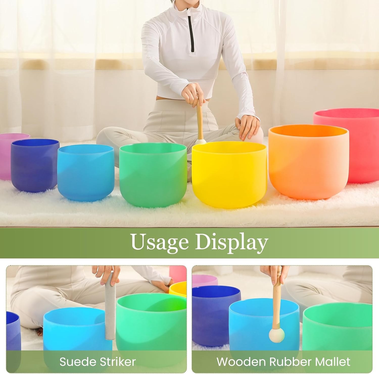 - Included Items: This set includes 7 colored crystal singing bowls, each crystal sound bowl tuned to the 432Hz frequency known for meditation.The bowls range in size from 6-12inch and cover a range of chakra-adapted tones suitable for a variety of sound healing and meditation practices. The set meditation accessories includes 2 carrying cases, 1 suede mallet, 1 rubber mallet and 7 rubber o-rings.
