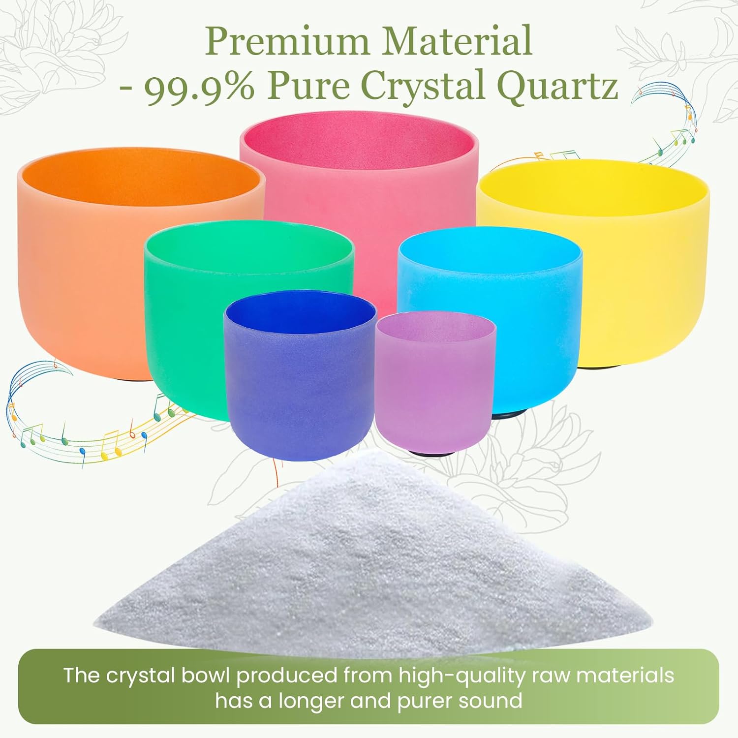 - Premium Materials: Made from 99.9% high-purity quartz, these crystal bowls are designed for optimal sound resonance. The colored finish not only enhances their aesthetic appeal but also contributes to the clarity and purity of the sound produced.The sound of the music bowl helps reduce anxiety and stress and promotes relaxation and meditation.