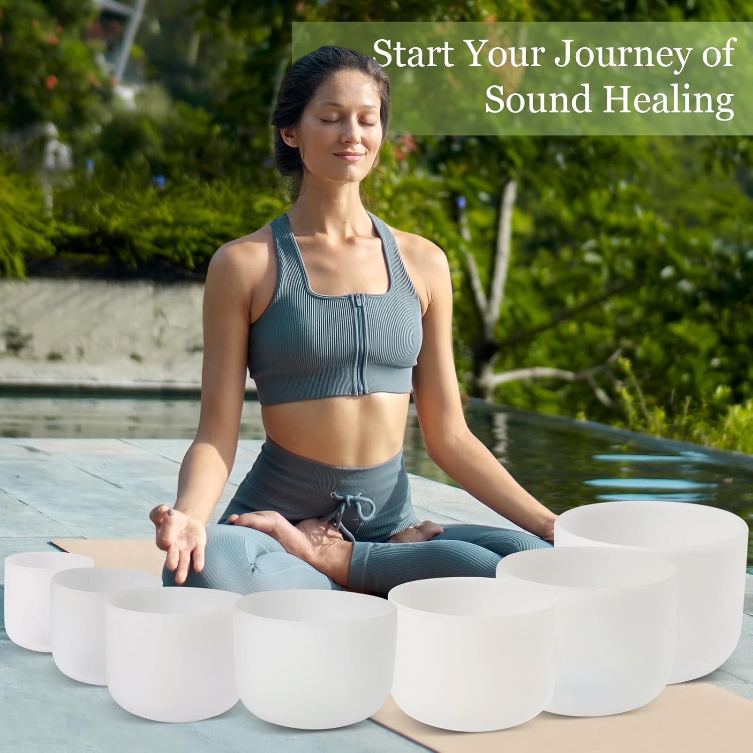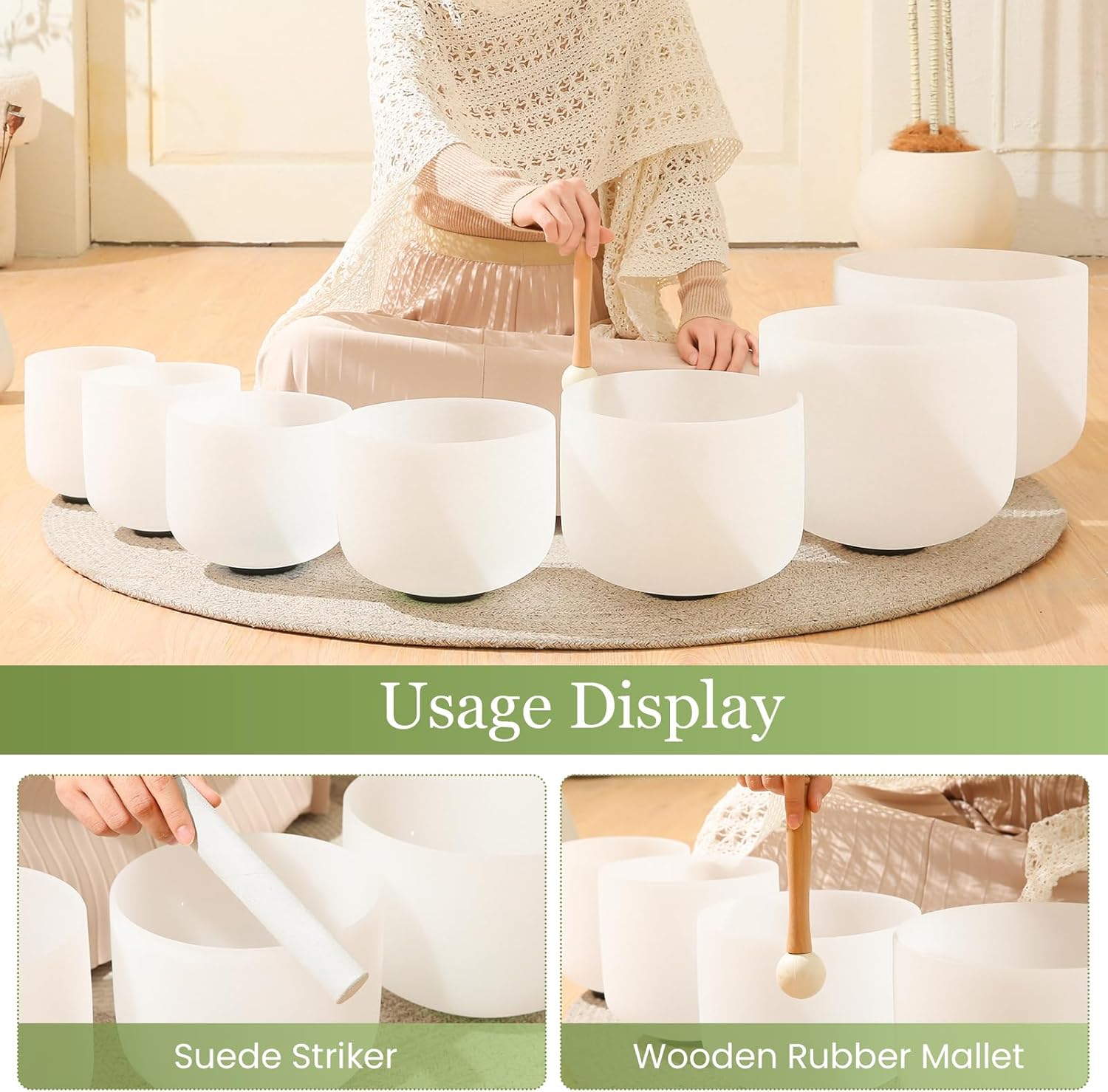 - Included Items: This set includes 7 crystal singing bowls, each crystal sound bowl tuned to the 432Hz frequency known for meditation.The bowls range in size from 6-12inch and cover a range of chakra-adapted tones suitable for a variety of sound healing and meditation practices. The set meditation accessories includes 2 carrying cases, 1 suede mallet, 1 rubber mallet and 7 rubber o-rings.