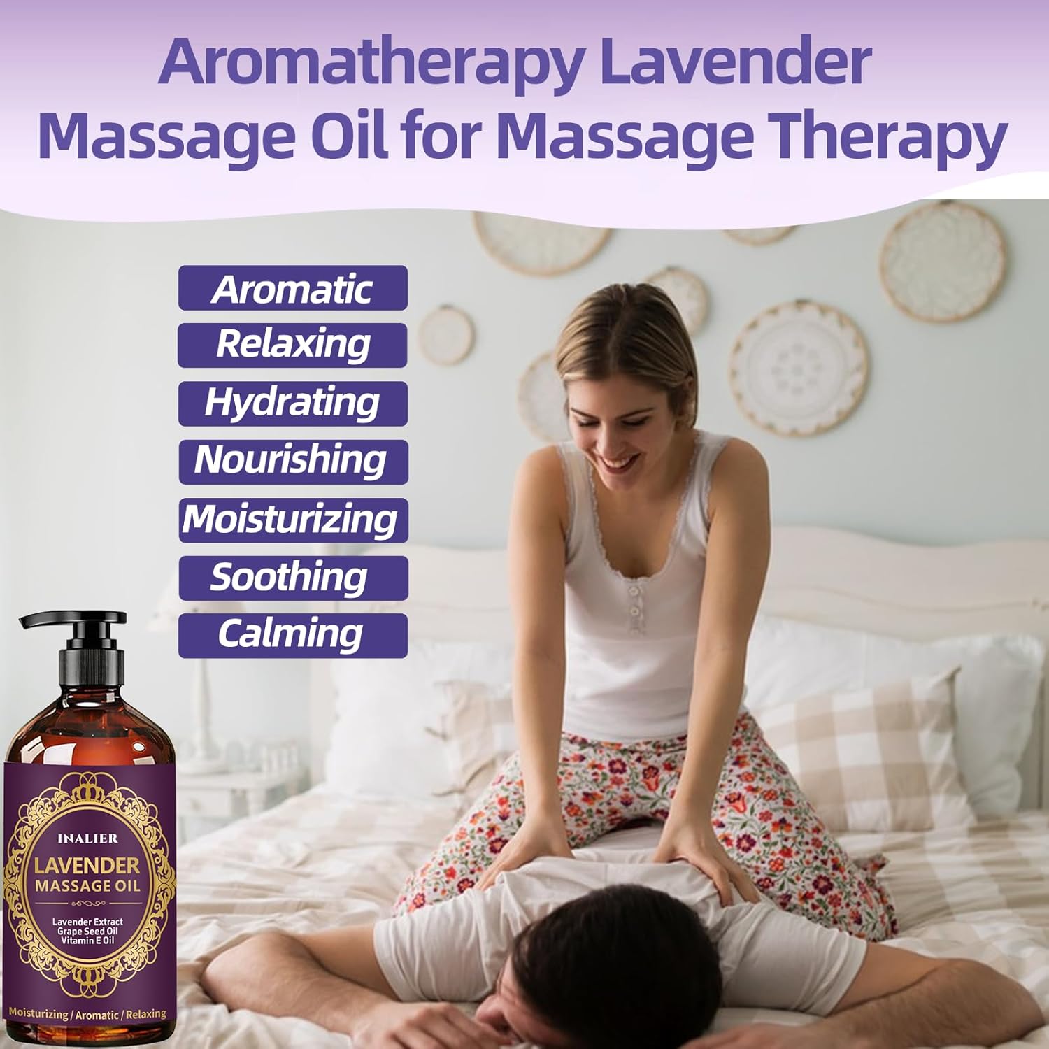 - Scented Relaxing Lavender Massage Oil:Lavender oil carefully crafted with wonderful ingredients such as Lavender Essential Oil, Grape seed Oil, and Arnica Oil; Therapy massage oil largely used in massage and aromatherapy.Great for Bath, Massage,GuaSha,Hair Care,Body Relaxing.Suitable for all skin types. perfect for a relaxing massage, while leaving skin feeling nourished and hydrated.a spa that can be done at home, no longer need to spend a lot of money to go to a beauty salon for a massage
