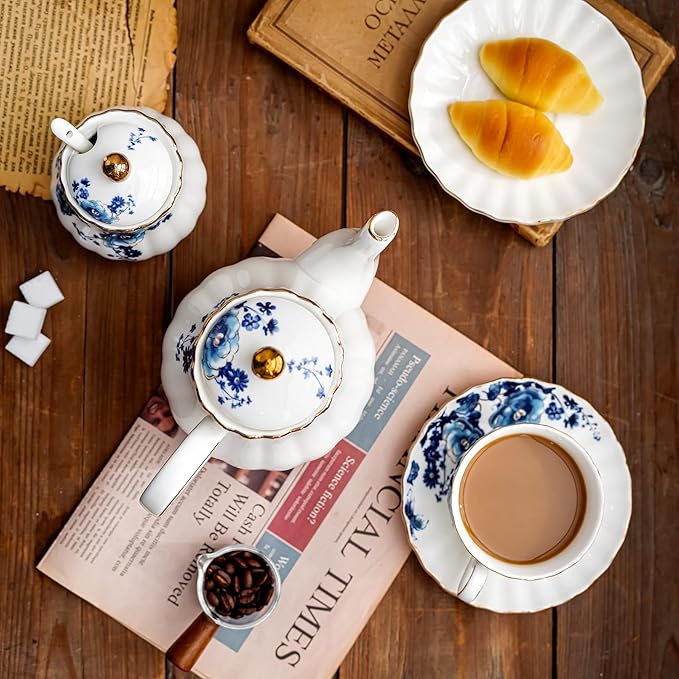 Tea Pot, Porcelain Teapot 37oz,tea pots for tea party,Tea Infuser Pots for Blooming loose Leaf Tea (White with blue flower)