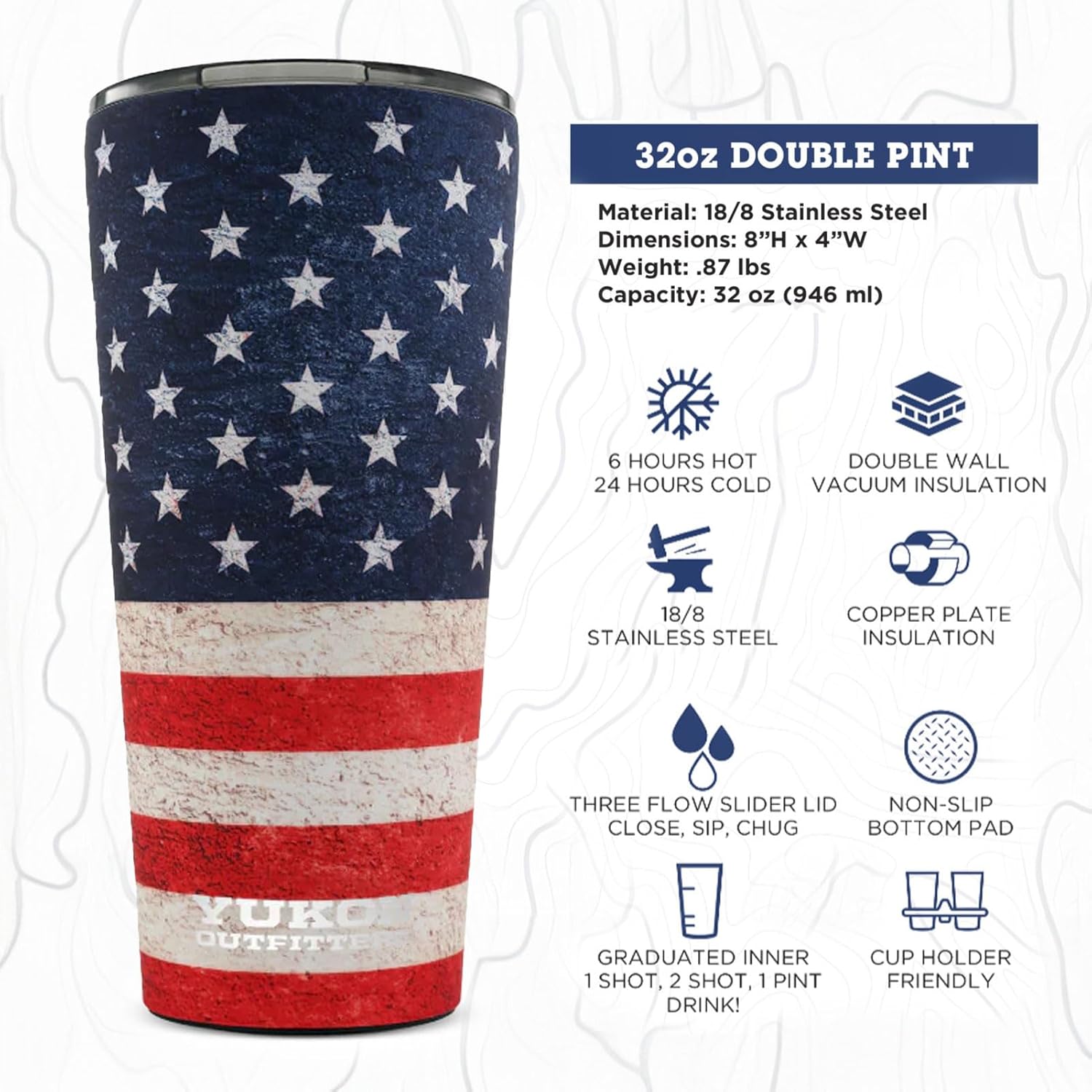 Yukon Outfitters 32oz Double Pint Double Wall Vacuum Insulated Stainless Steel Tumbler with Three Flow Lid | For Hot or Cold Beverage | Fits Most Cup Holders, USA Flag