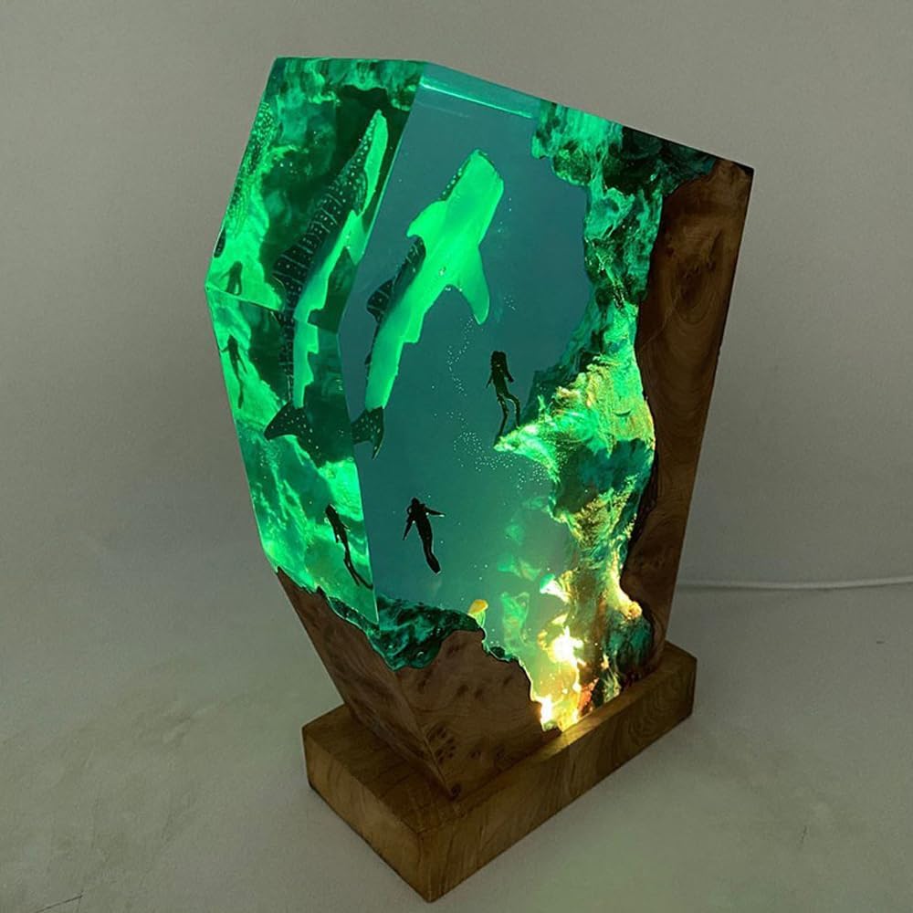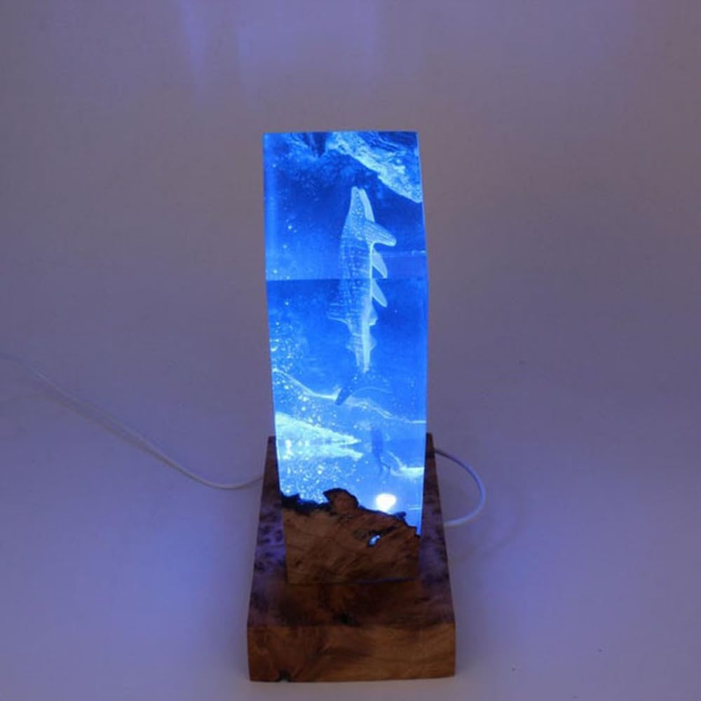 Whale Shark Ocean Resin Lamp, Handmade Wooden Table Resin Night Light, USB Port Art Ornaments for Home Office Decor, Scuba Diver Gifts for Birthday Holiday, Valentine's Day Gifts for Husband