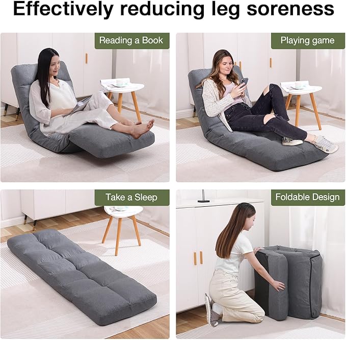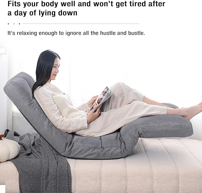 Floor Chair with Footrest Adjustable Backrest with 14 Positions Footrest 5-Position Adjustment Foldable Floor Gaming Chair for Easy Storage Linen Fabirc Chaise Lounge 086 (Grey)