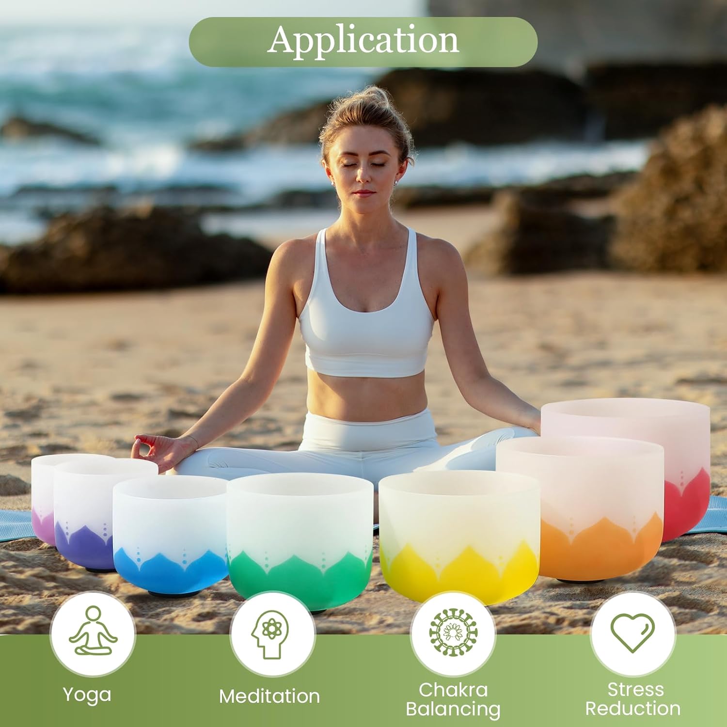 - Versatile Applications: These crystal singing bowls are ideal for sound healing, meditation, yoga, chakra balancing, stress reduction, chakra healing, spiritual and sound therapy. Whether it's a public, professional studio or a private scene, this product adapts well. With the premium textured crystal music bowl, you can enjoy a private healing journey with your family and friends anywhere, anytime.