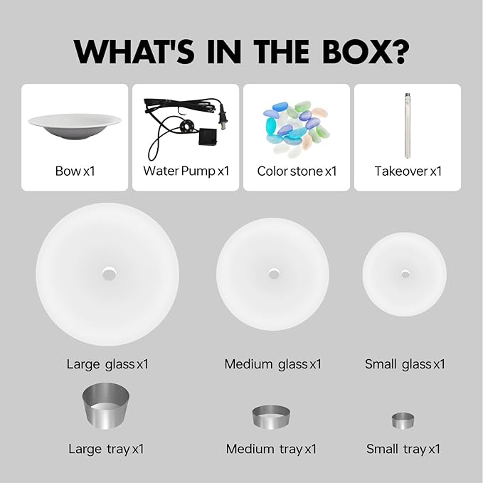 - 【High Quality Fountains】The size of indoor tabletop fountain is about Dia 12.6" x H 6.3", made of high quality aluminum alloy and glass material. The unique circular glass design and silver base make the modern fountain decor more high-end.