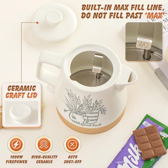 Ceramic Electric Kettle Pot 1 Liter, Teapot Rapid Boil For Coffee & Tea, Hot Water Boiler, Automatic Shut-Off, BPA-Free, Boil-Dry Protection, 1000W