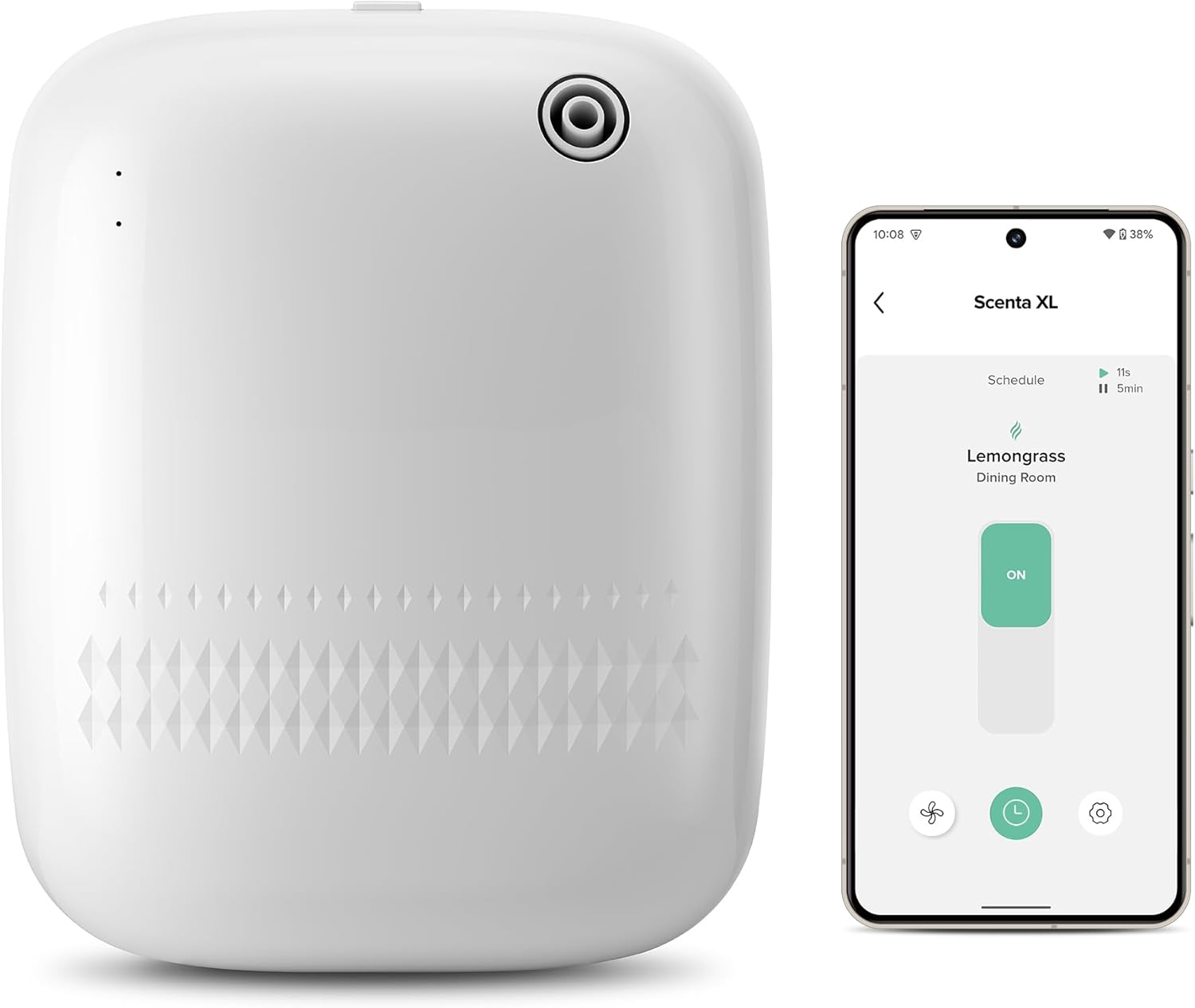 - Flexible Settings Enabled by Sleekpoint App: Download the Sleekpoint app from the Apple App Store (iOS) or Google Play Store (Android OS) and enjoy full controls over Scent XL via Bluetooth: [Power ON/OFF] Easily turn the device or booster fan on/off. [Scheduling] Set up to 5 schedules/diffusing scenes for different times and days to meet your needs for various occasions. [Diffusing Time] 3 sec - 5 min [Pause Time] 5 sec - 19 min. Please stay within 20 feet of the device to connect