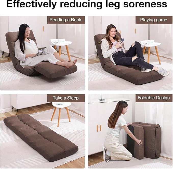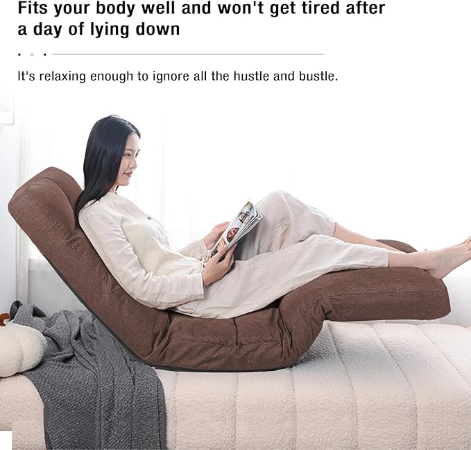 Floor Chair with Footrest Adjustable Backrest with 14 Positions Footrest 5-Position Adjustment Foldable Floor Gaming Chair for Easy Storage Linen Fabirc Chaise Lounge 086 (Brown)