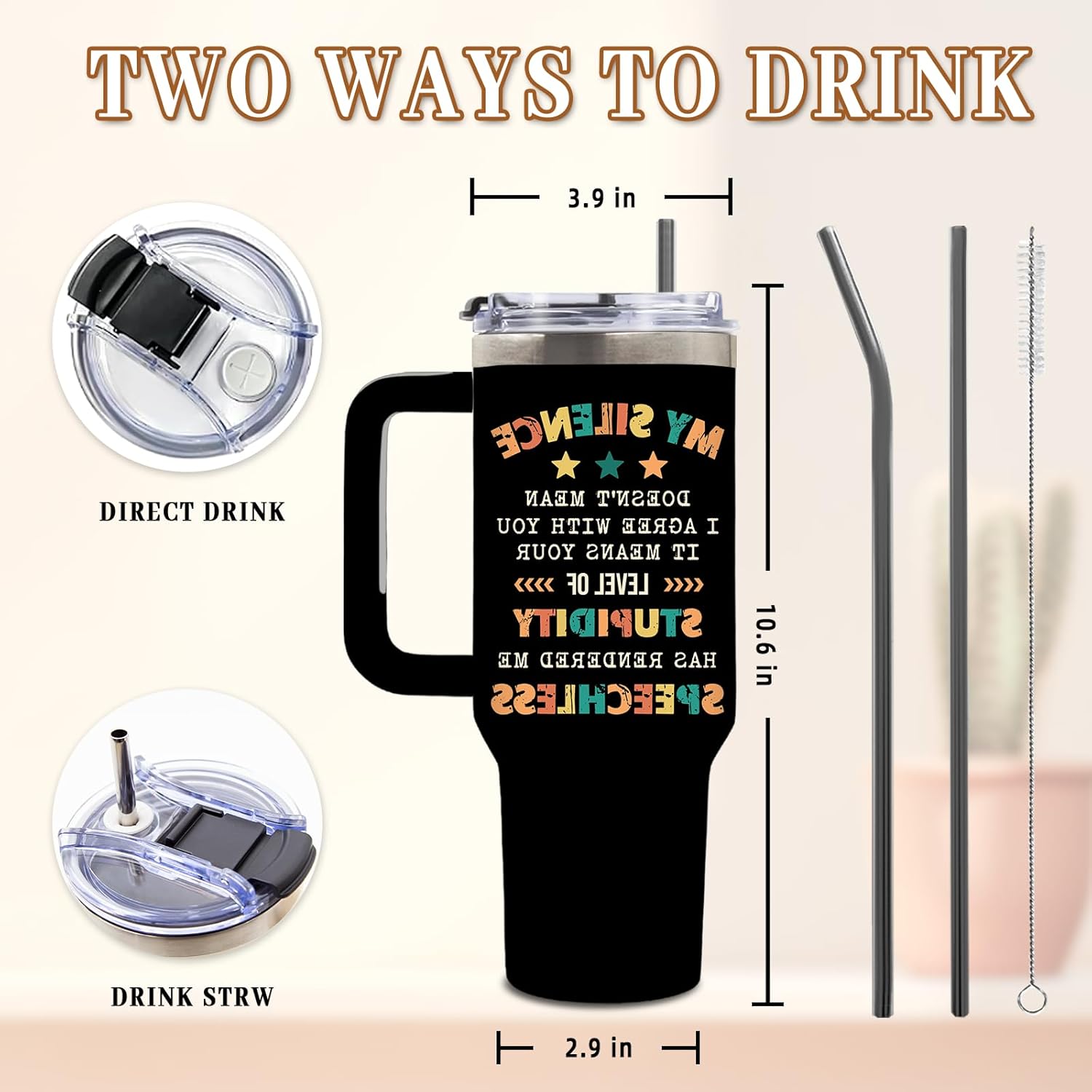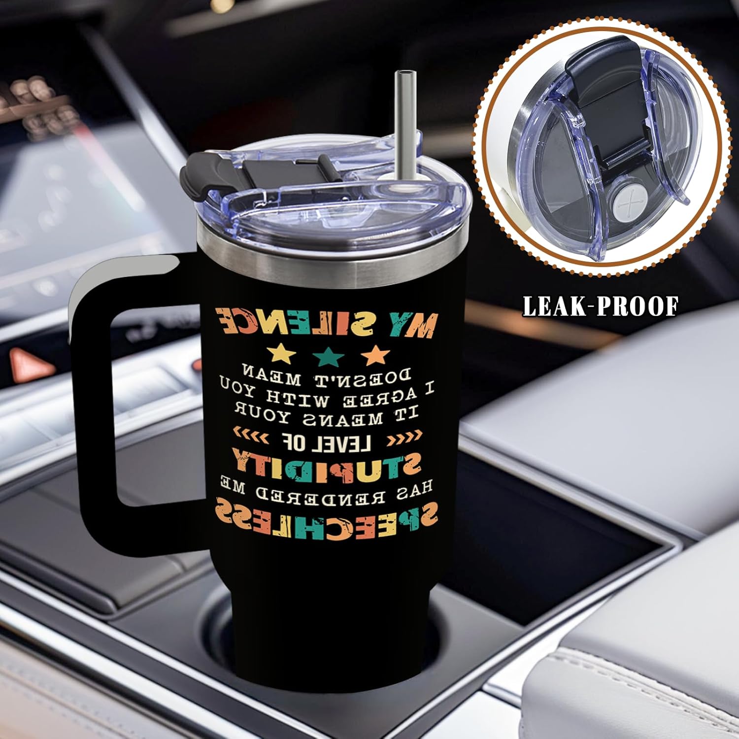- Humorous Design with Bold Statements: Featuring the witty phrase “MY SILENCE doesn’t mean I agree with you. It means your level of STUPIDITY has rendered me SPEECHLESS,” this tumbler combines humor with vibrant, colorful typography and playful details like stars and arrows, set against a sleek black background for a modern and eye-catching look