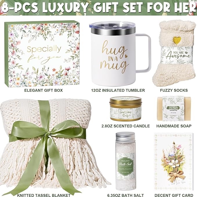 - 8PCS SELF CARE GIFTS FOR WOMEN: MAYICIVO Self Care Gifts Spa Gift Baskets Birthday Gifts for Women, contains luxury items curated with love & care, including a 50x66in ivory knitted tassel blanket, 12oz insulated tumbler w/ handle, 2.8oz vanilla coconut scented candle, Himalayan bath salt, handmade oatmeal soap, fuzzy socks, decent gift card and gift box. Such a heart-warming thinking of you gifts for women, stress relief gifts for women, relaxation gifts for women, thank you gifts for women
