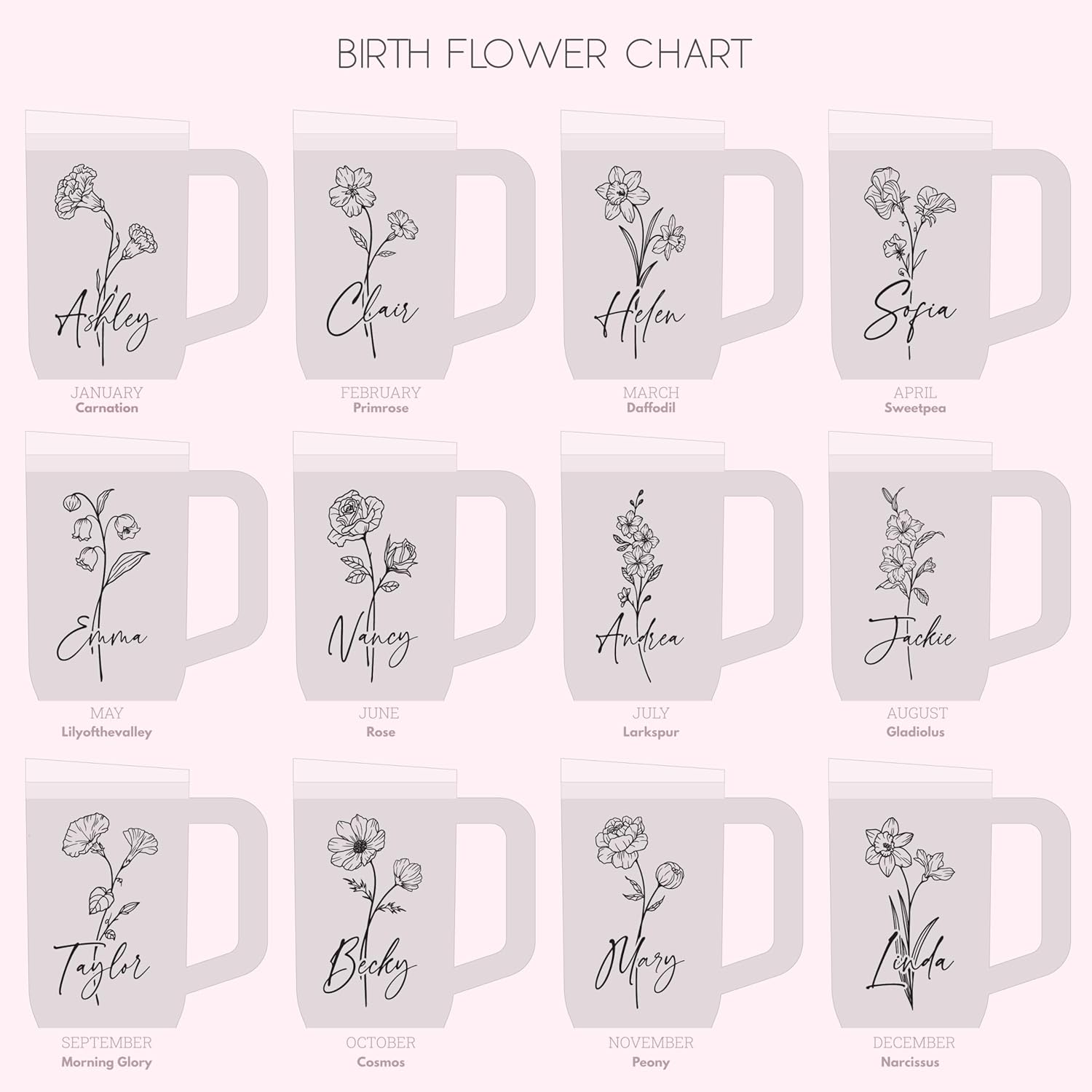 - Personalized Birth Flower Design: Celebrate individuality with this custom engraved 40 oz tumbler with handle, featuring your chosen birth month flower and name. Select from 12 elegant floral designs that add a meaningful and personal touch, making it the perfect keepsake or gift for loved ones.
