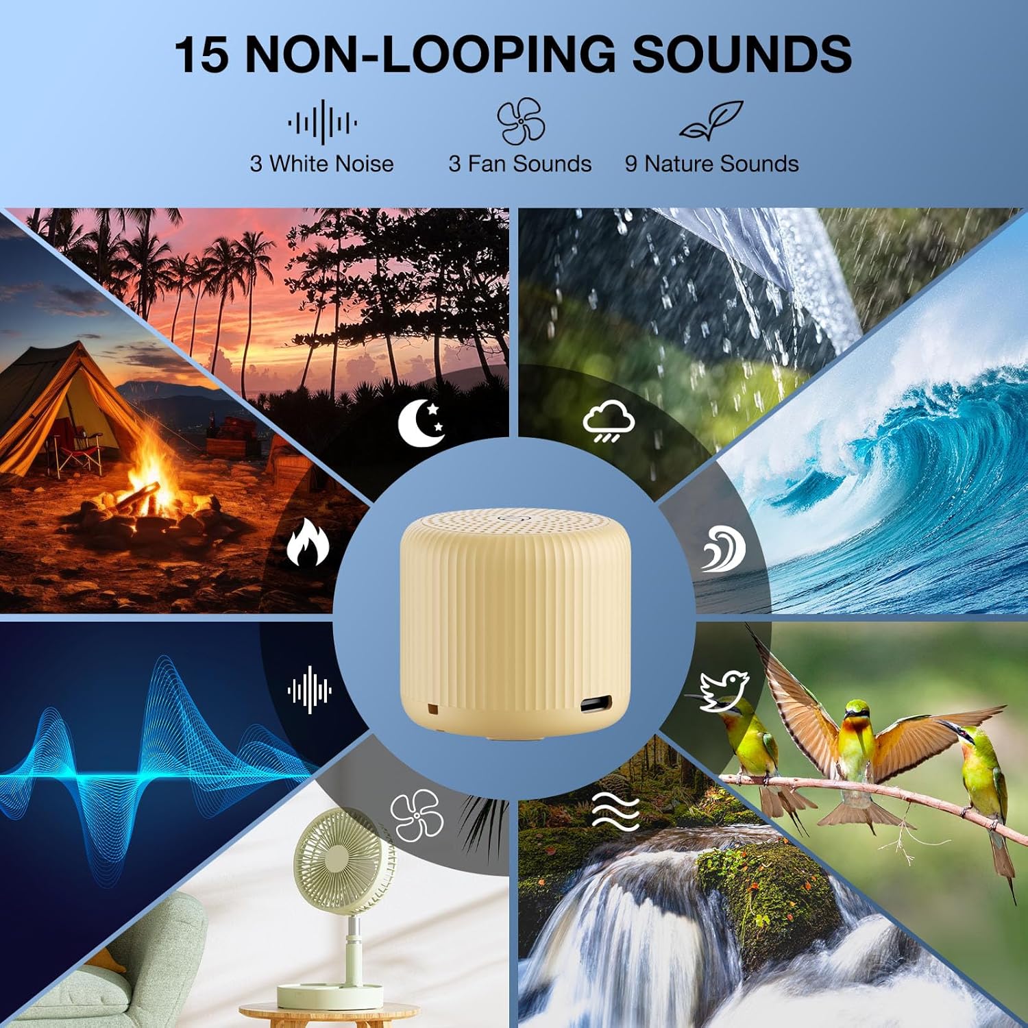 - 【15 Non-Looping Sounds】The white noise sound machine offers a variety of soothing natural sounds, including white noise, pink noise, brown noise, fan sounds, rain sounds, ocean waves, summer nights, crackling campfire, bird sounds, and babbling brook
