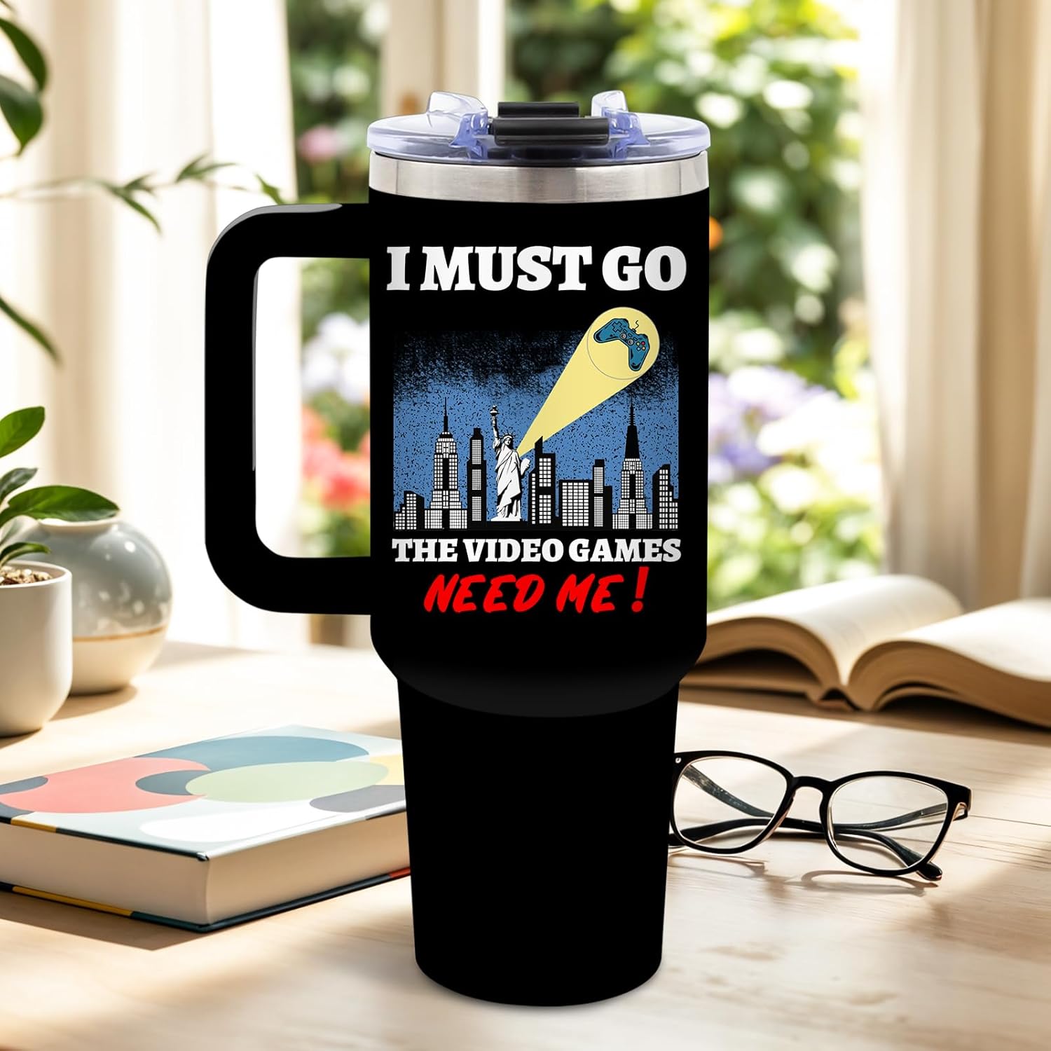 - Bold Gamer Design That Stands Out: This 40 oz tumbler features the eye-catching "I MUST GO THE VIDEO GAMES NEED ME" design, complete with a dramatic city skyline and spotlighted game controller, blending humor and heroic vibes to create the ultimate gaming statement for everyday use