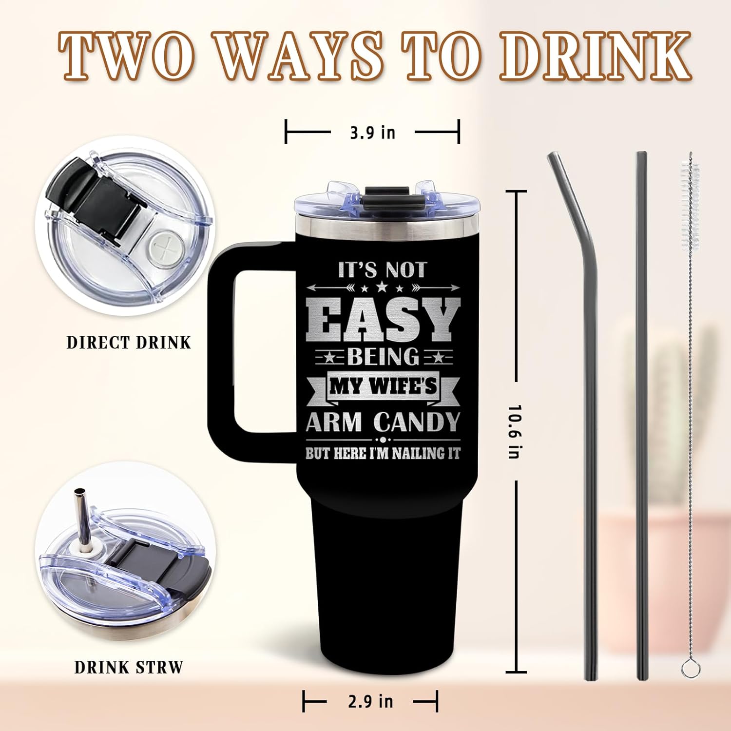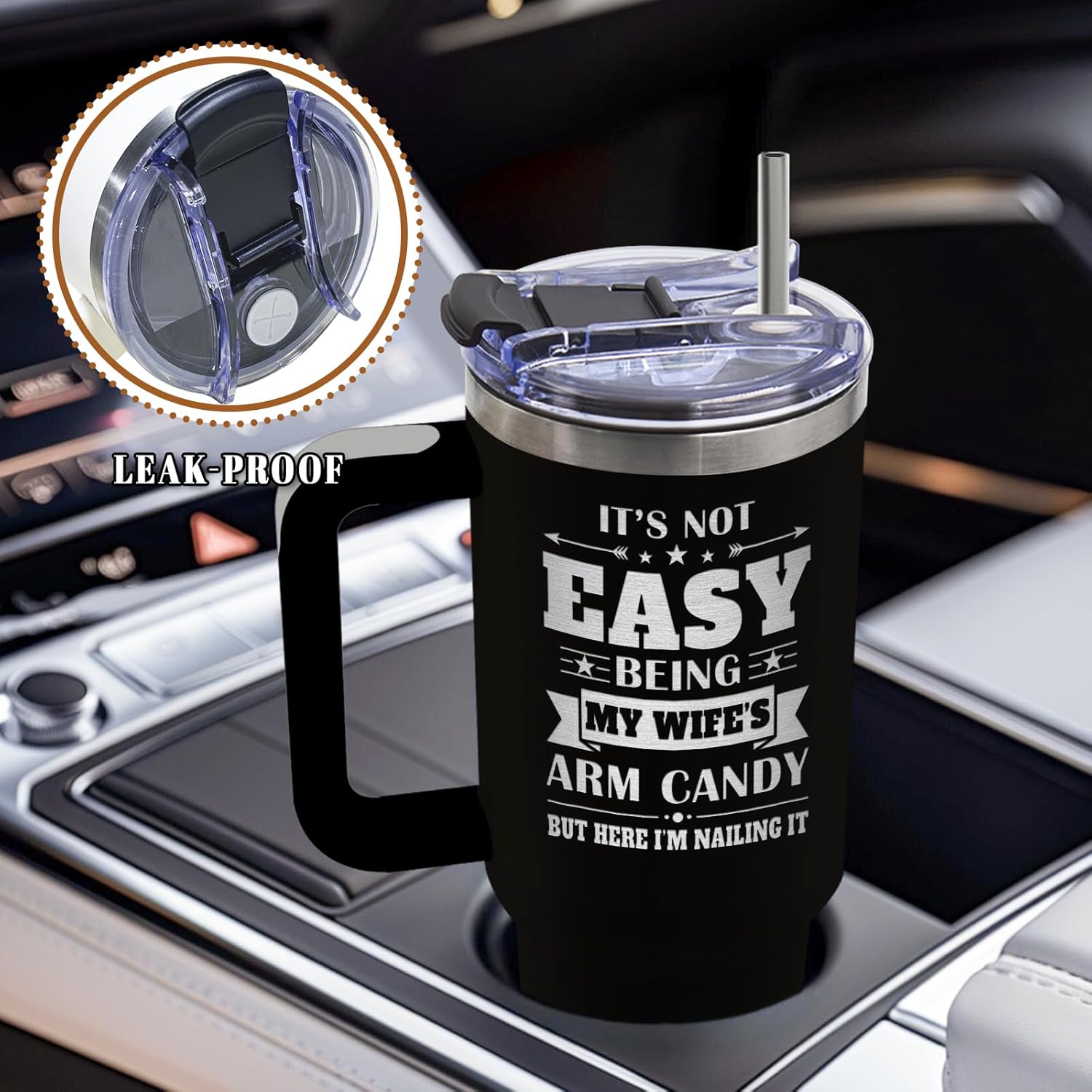 - Humorous Design: This 40 Oz tumbler features a playful message "Arm Candy" that humorously pokes fun at relationships, making it a nice gift for husbands who appreciate a little lighthearted fun and affection