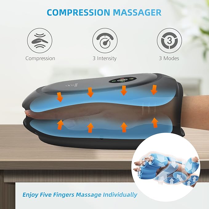 - Vibration Massager:Comfier hand massager features 3 vibration modes, 3 intensity levels and 3 heating levels, combines compression massage that can offer you the closest feeling to a real hand massage and help relieve arthritis pain and finger numbness