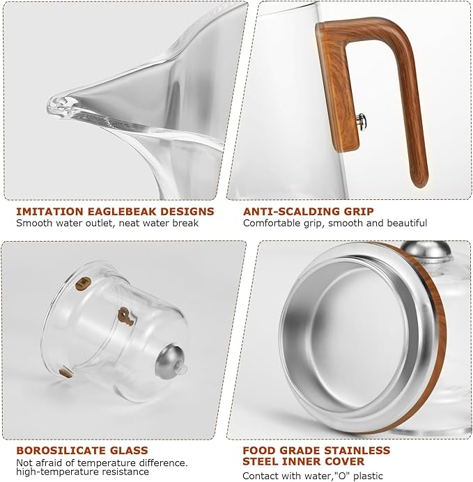 - Heat-Resistant Borosilicate Glass : Made with premium, heat-resistant glass and anti-scald handles, this teapot is perfect for both hot and cold beverages