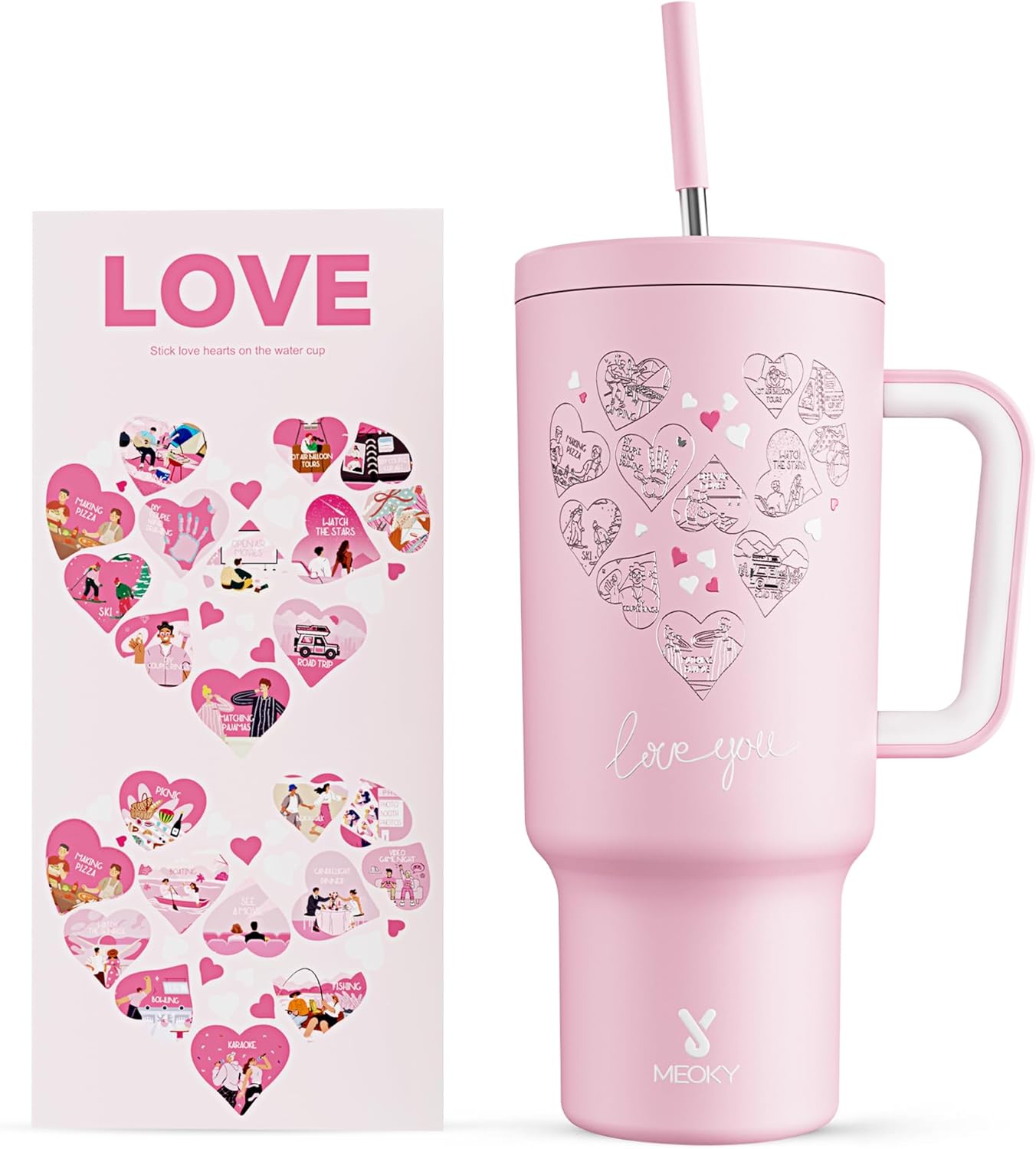 Meoky 40 oz Tumbler with Handle for Couples: Stainless Steel Insulated Tumbler with 24 Waterproof Love Stickers - Girlfriend Boyfriend Wife Husband, Love You