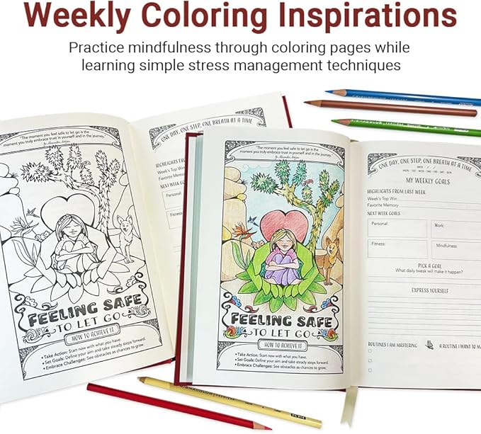 - Creative Decompression: Includes weekly coloring pages to unwind and relax, creating stress-relief art breaks without distracting from journaling.