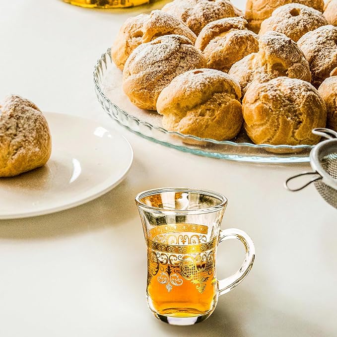 Turkish Tea Glasses Set of 6 - Gold Moroccan Tea Cups with Handle - 5 oz Footed Glass Coffee Mugs for Hot Cold Beverages Drinks