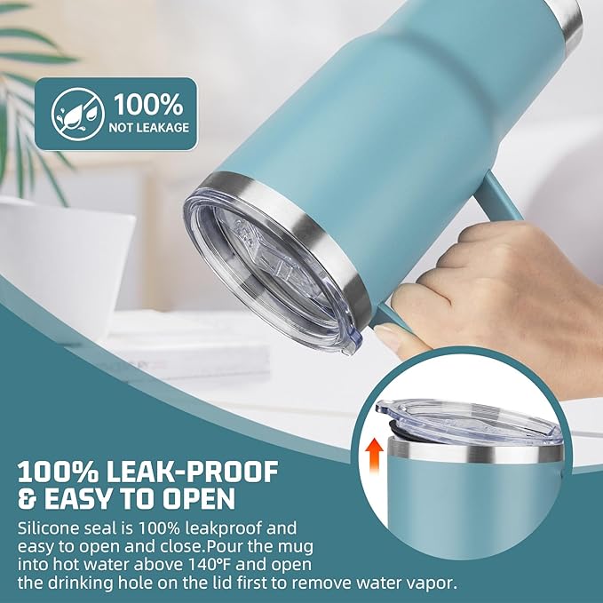 - COMFORTABLE HANDLE DESIGN: The handle of this travel coffee mug is ergonomically designed, the curvature of the handle fits naturally with the fingers, comfortable to hold, whether it is one-handed operation or long time holding, it can maintain a comfortable hand feeling and reduce fatigue. The material of the handle has been treated with anti-slip treatment, so that it can be held firmly even in a wet environment to avoid slipping off.