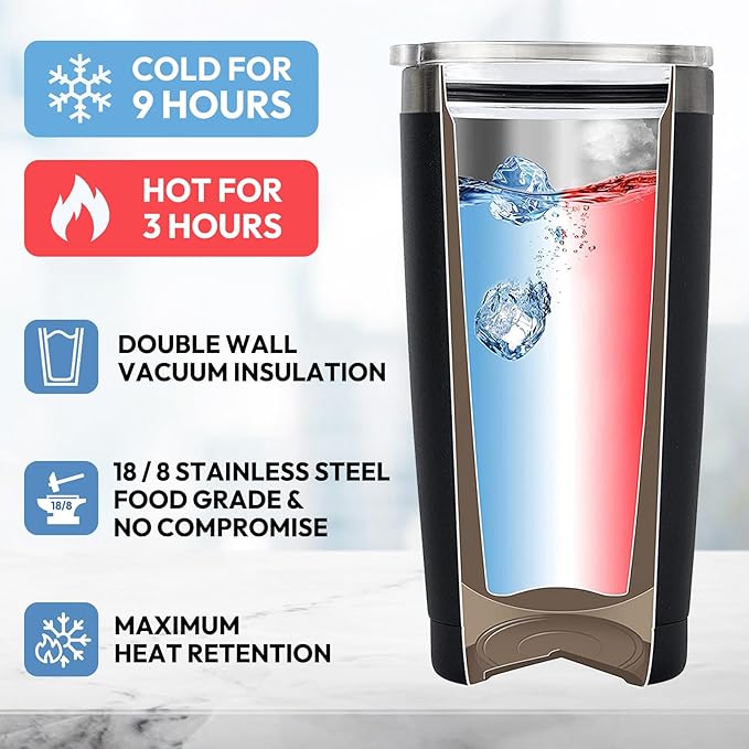 - DOUBLE-WALL VACUUM INSULATION: This tumbler is made from 18/8 food-grade stainless steel, making it durable, unbreakable, and resistant to rust. It won't retain or transfer the flavors of your drinks. The double-wall vacuum design provides excellent insulation, keeping beverages hot for up to 3 hours and cold for up to 6 hours in typical conditions