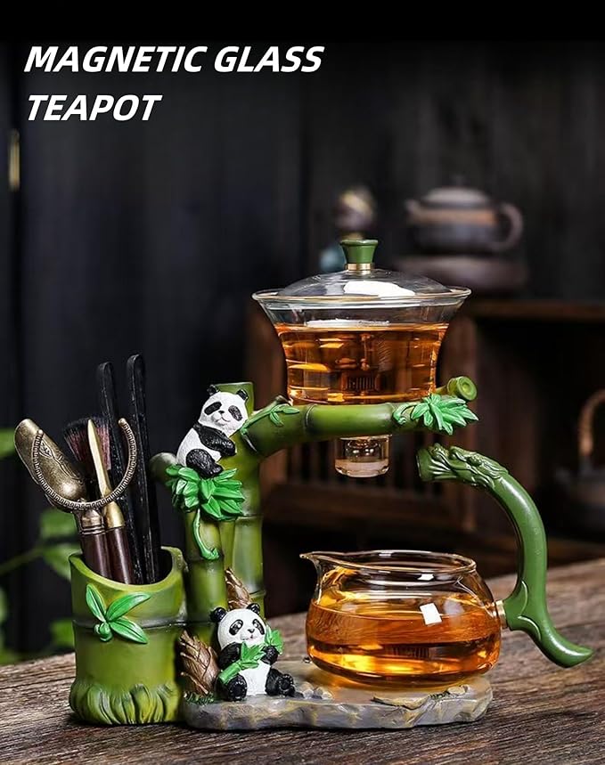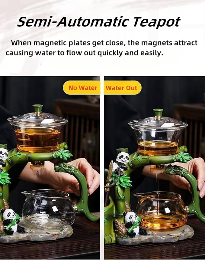 Tea Infuser Lazy Kungfu Magnetic TeaPot Semi-Automatic Drip Glass Teapots Panda Heat-Resistant Tea Maker Set(Iclude Six Gentlemen of Tea Set)
